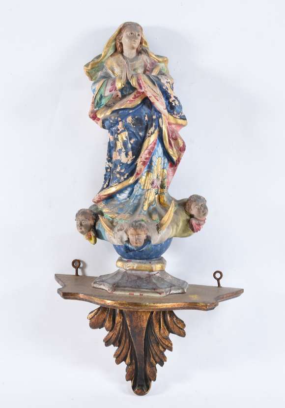 Nossa Senhora - Imagem de madeira policromada e realces dourados. Acompanha peanha de madeira entalhada e dourada (Ob...