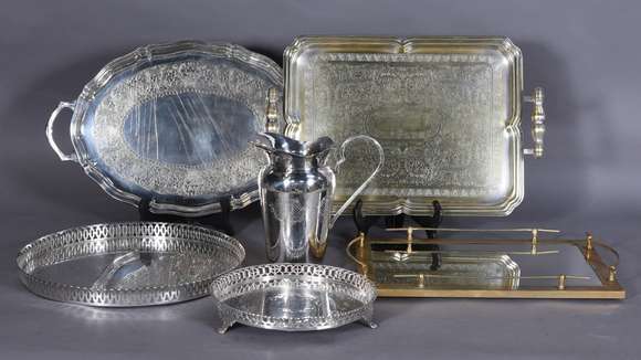 Seis peças diversas de metal, sendo tres bandejas, jarra para água, duas salvas redondas com galerias vazadas. (desga...