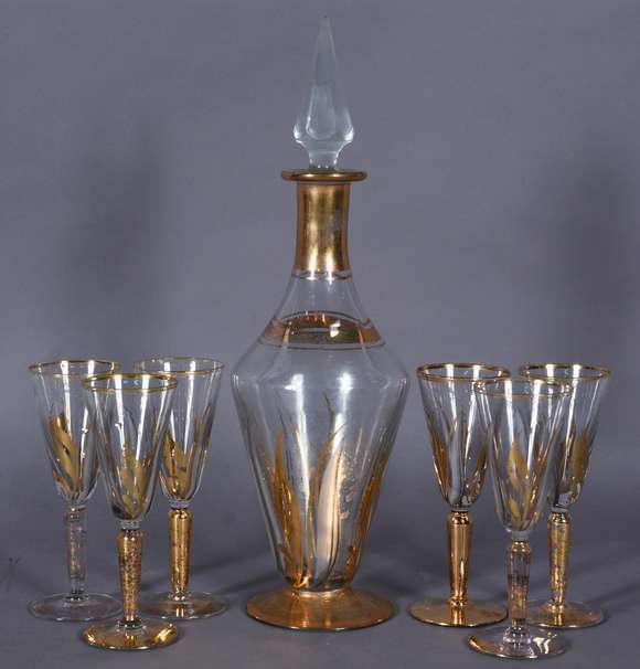 Conjunto com garrafa e 6 cálices de cristal com detalhes em dourado.