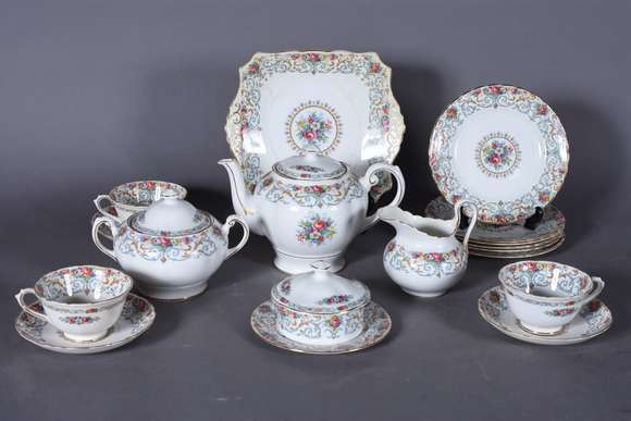 Serviço para chá de porcelana inglesa "Tuscan Fine Bone China" composto de: 3 xicaras de chá com pires, prato para pe...