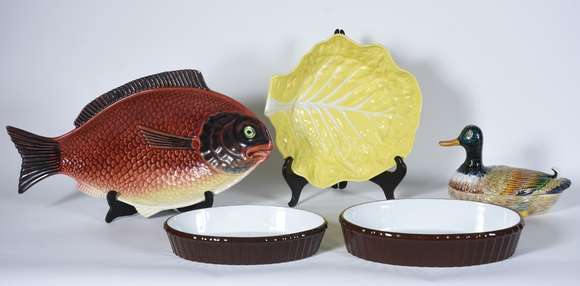 Cinco peças de faiança composto de: 2 refratários, travessa de peixe, bowl amarelo e pato.