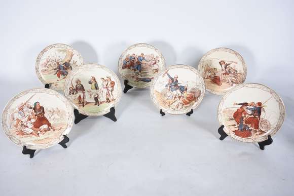Conjunto com 7 pratos de faiança europeia decorados com figuras de militares em cenas de diversas batalhas.