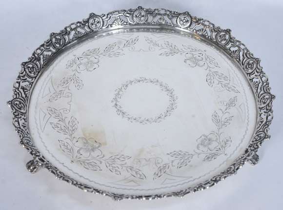 Salva de prata portuguesa, galeria com flores vazadas. Peso da prata: 730 g (Por motivos de segurança a peça não se e...