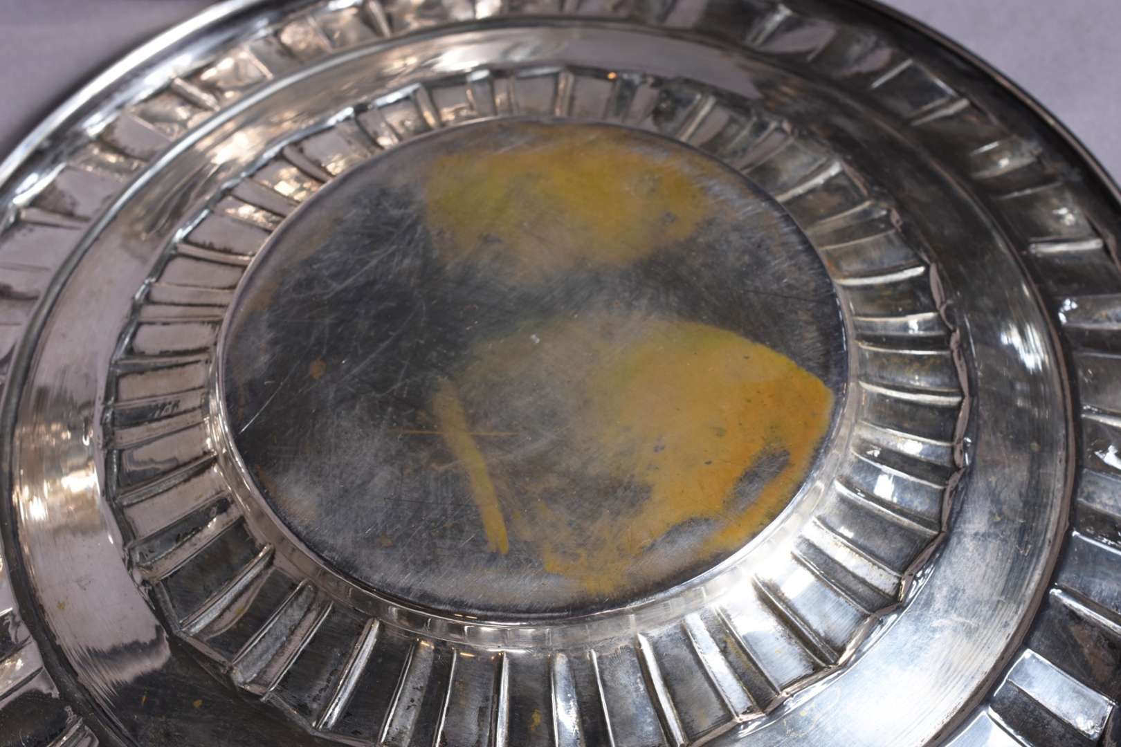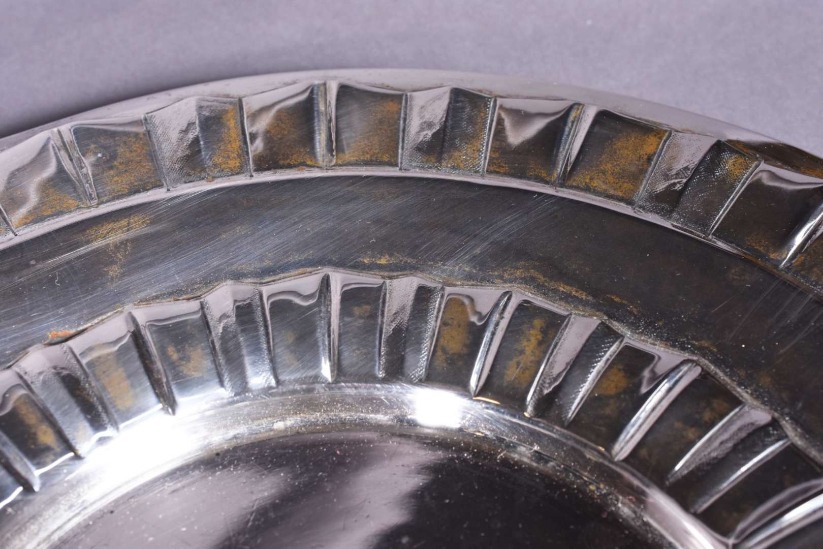 Salva de metal prateado, fundo cinzelado, borda com concheados em relevo, pés de garra.