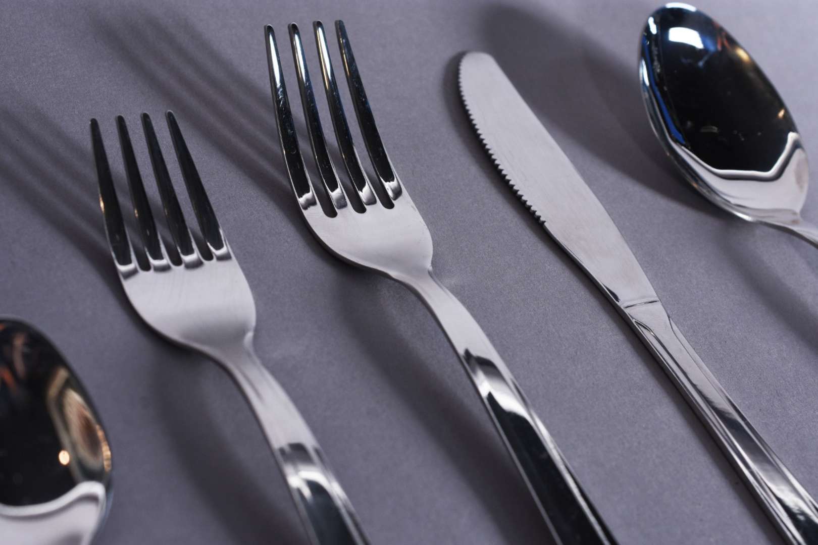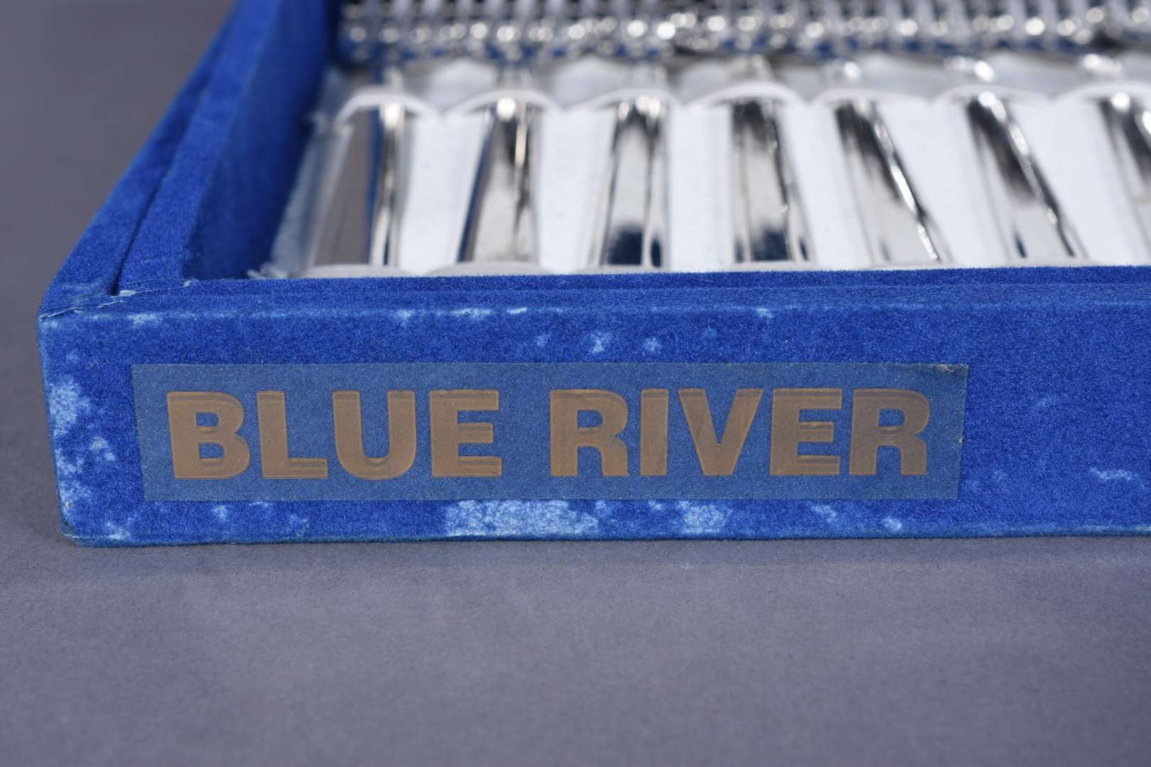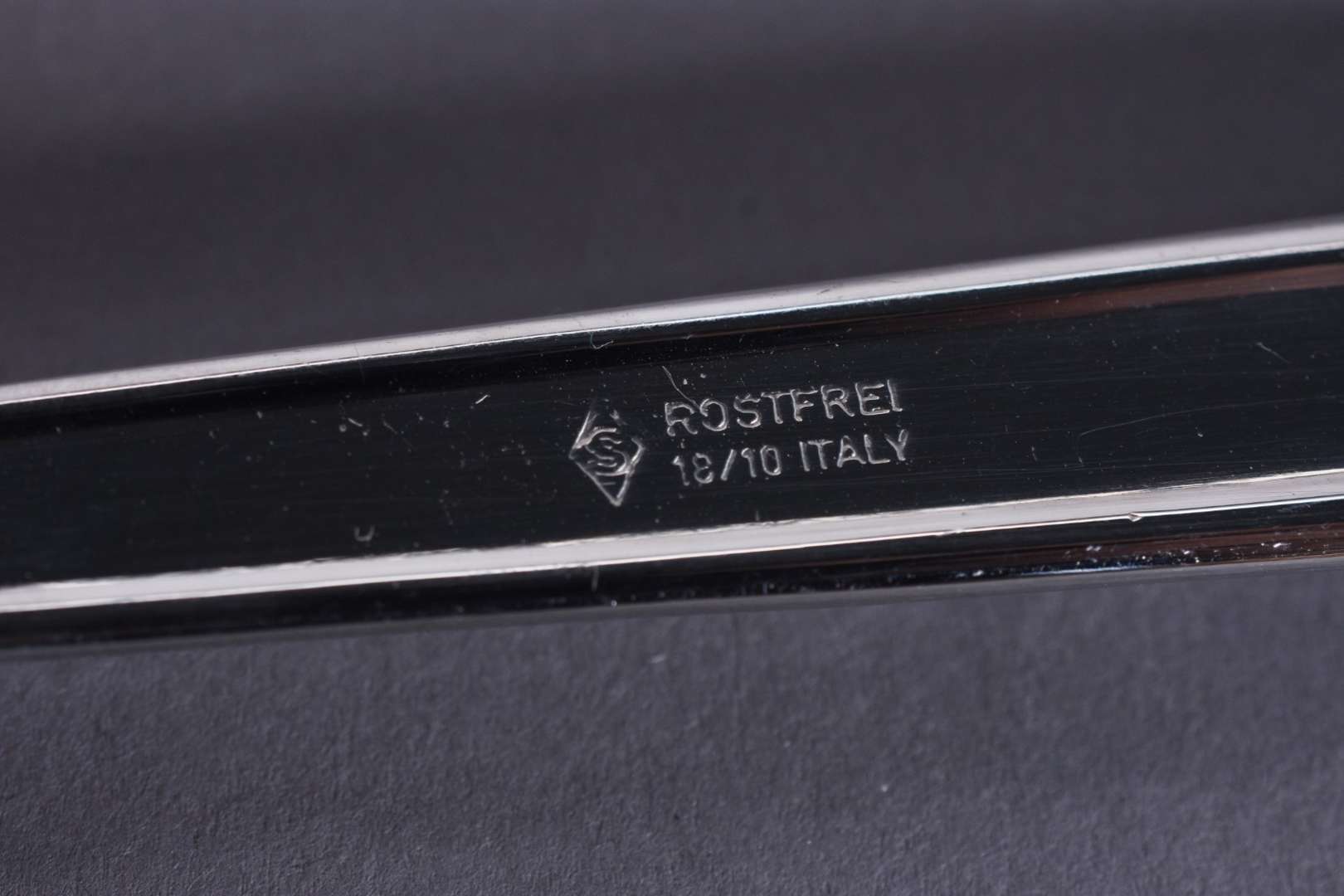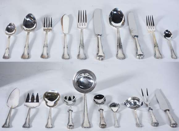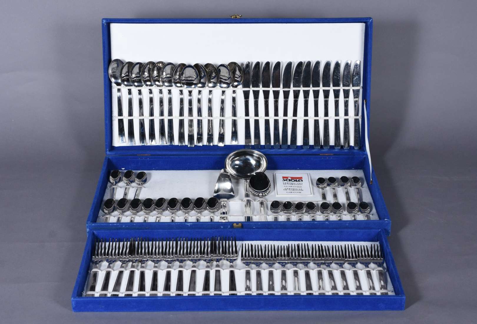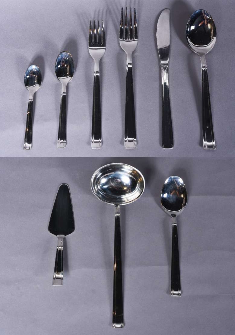 Faqueiro italiano de inox composto de: 12 garfos, 12 colheres, 12 facas grandes; 12 garfos e 12 colheres para sobremesa; 12 colheres para chá e 3 peças para servir. No estojo. Total: 75 peças.