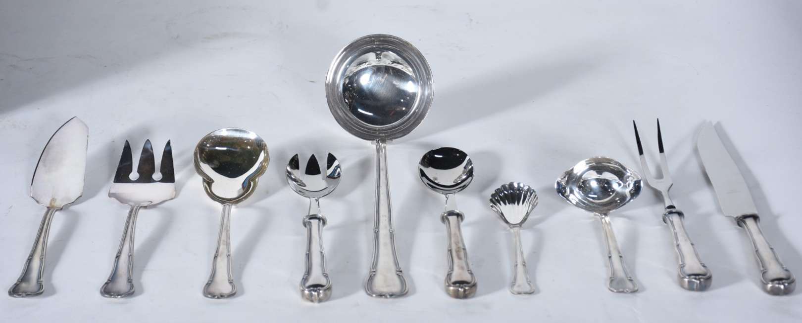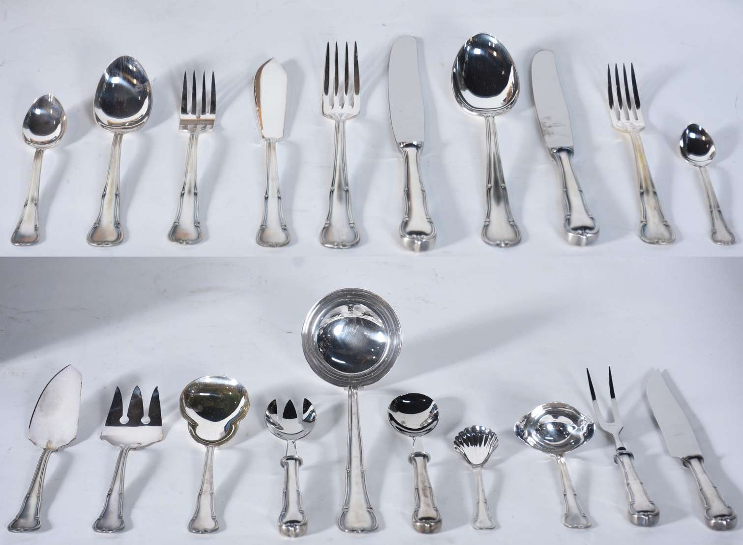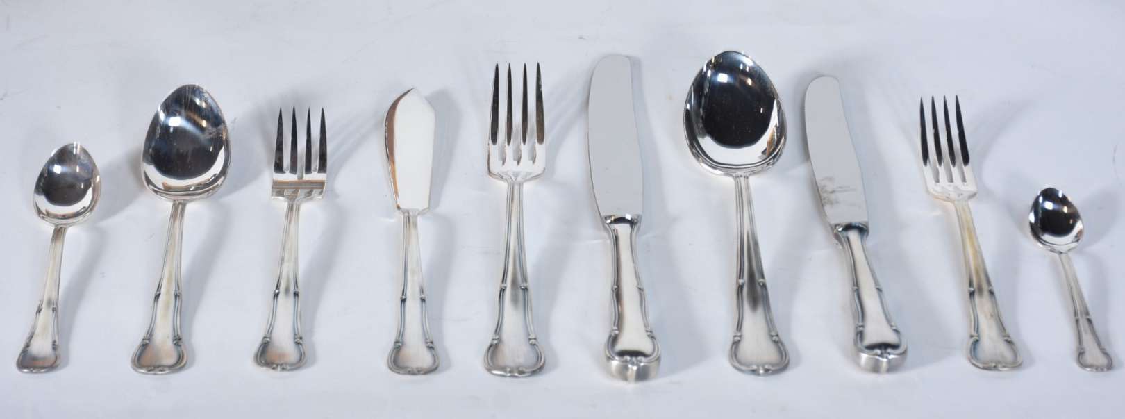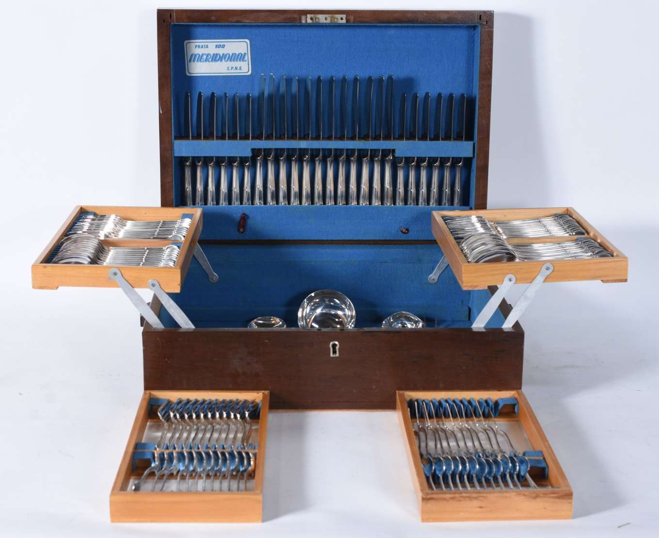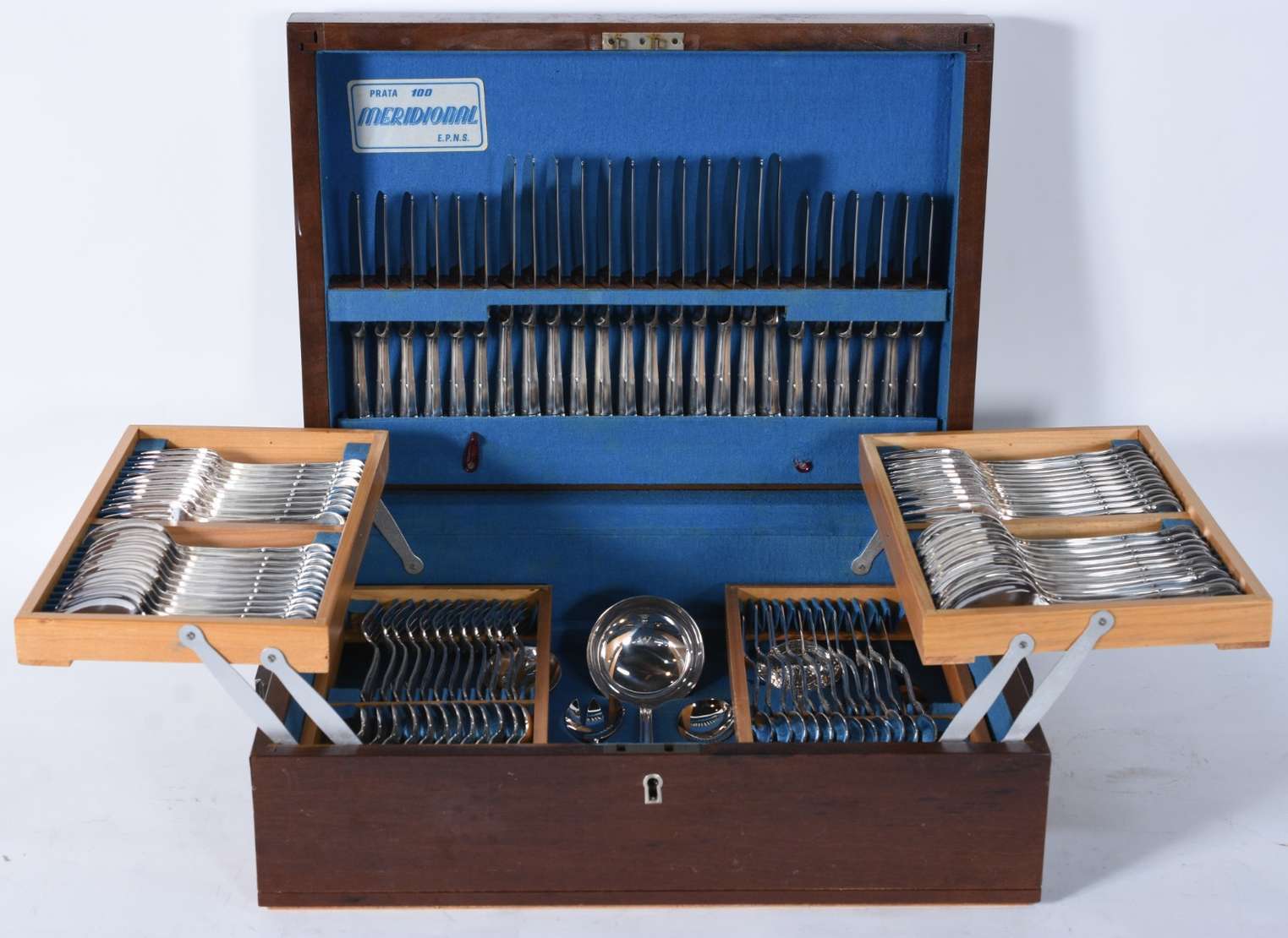 Faqueiro de metal prateado modelo "Imperial America", composto de: 12 colheres, 12 garfos, 12 facas grandes; 12 colh...