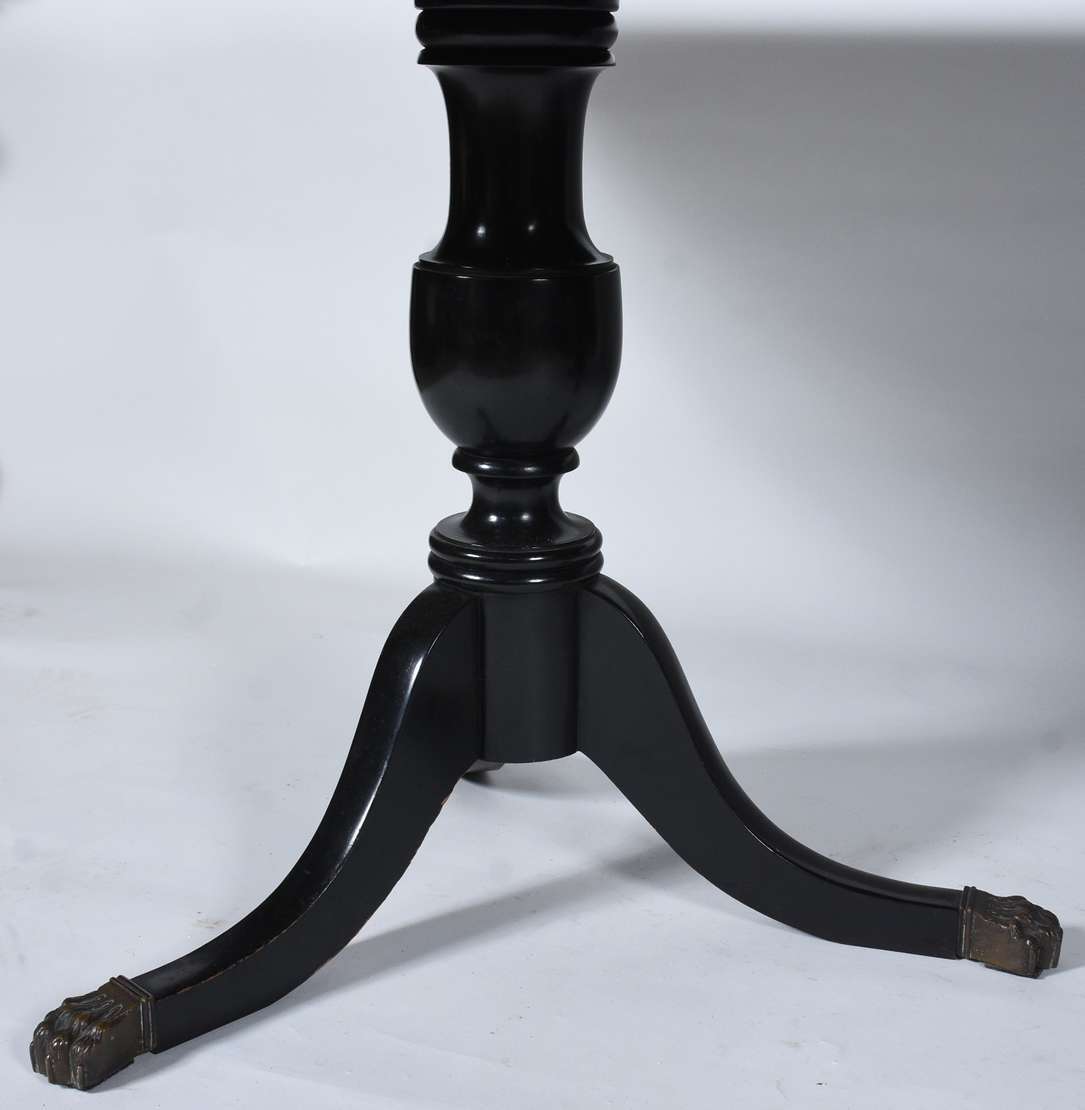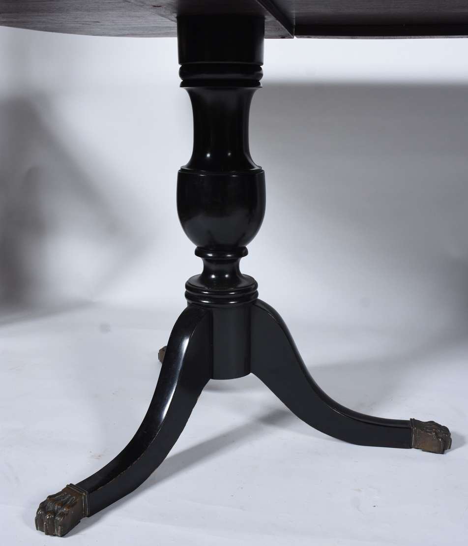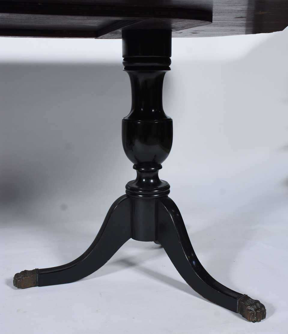 Par de mesas auxiliares de madeira nobre, tampos feitio oitavado apoiados em coluna central que terminam em platô inf...