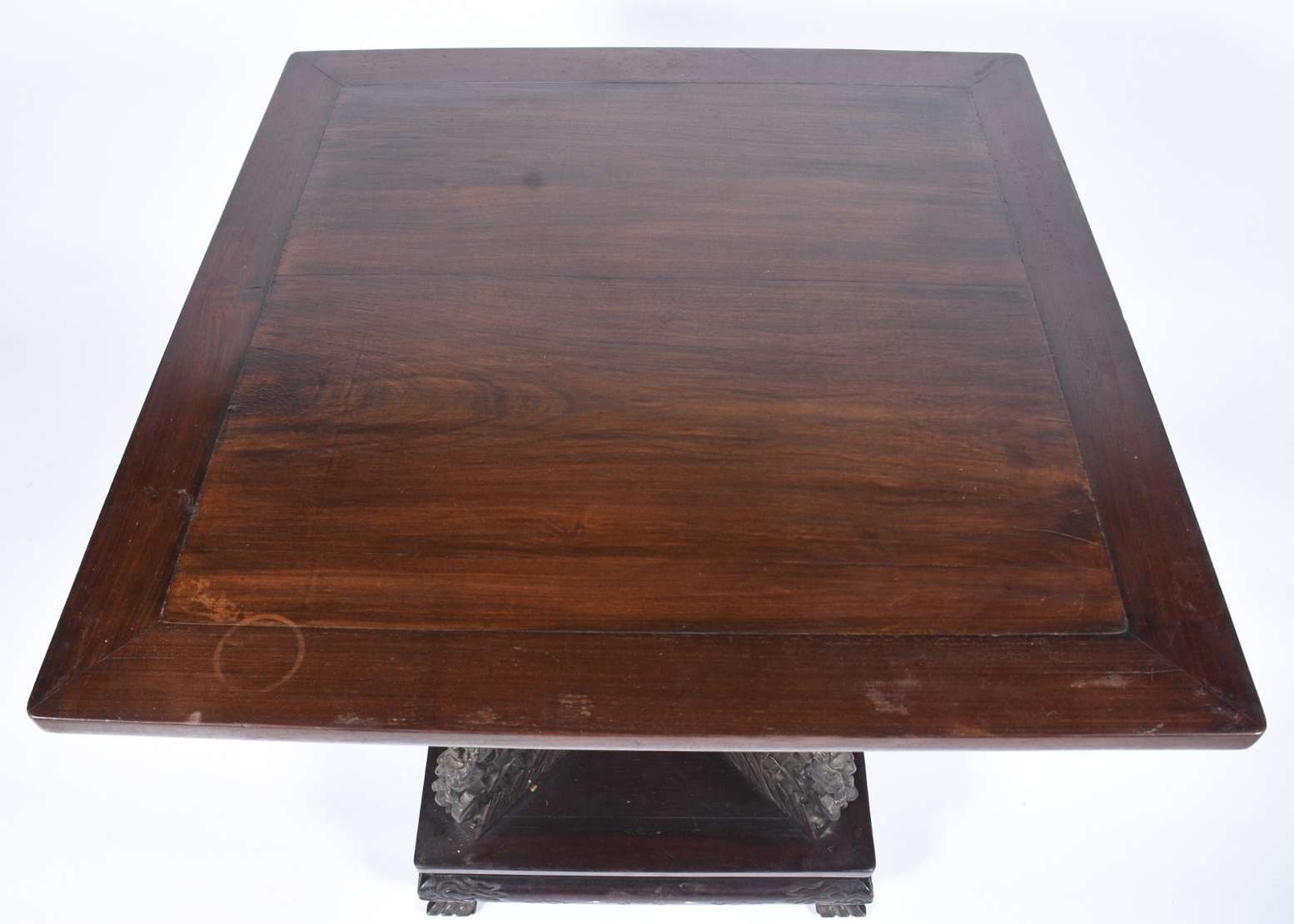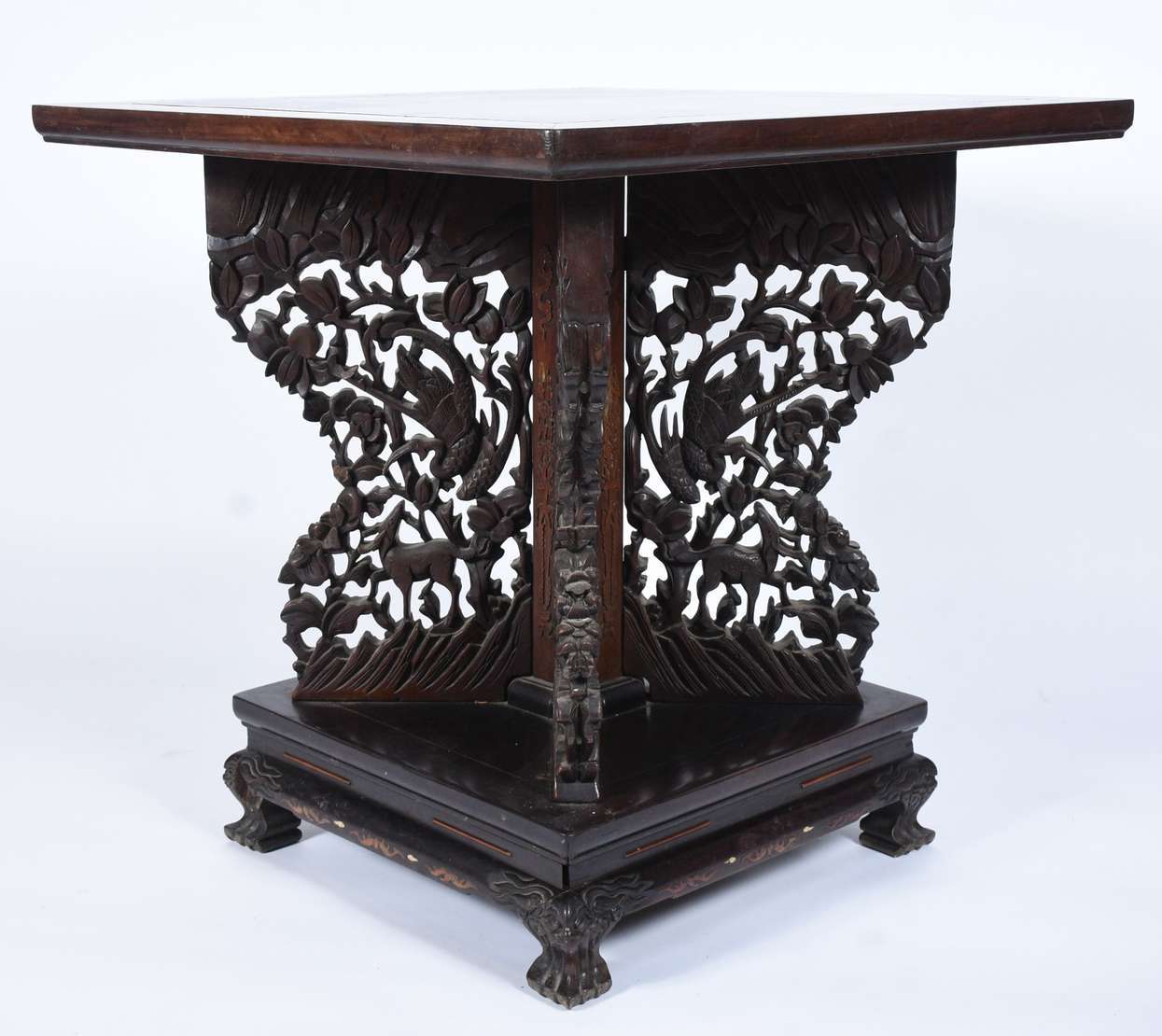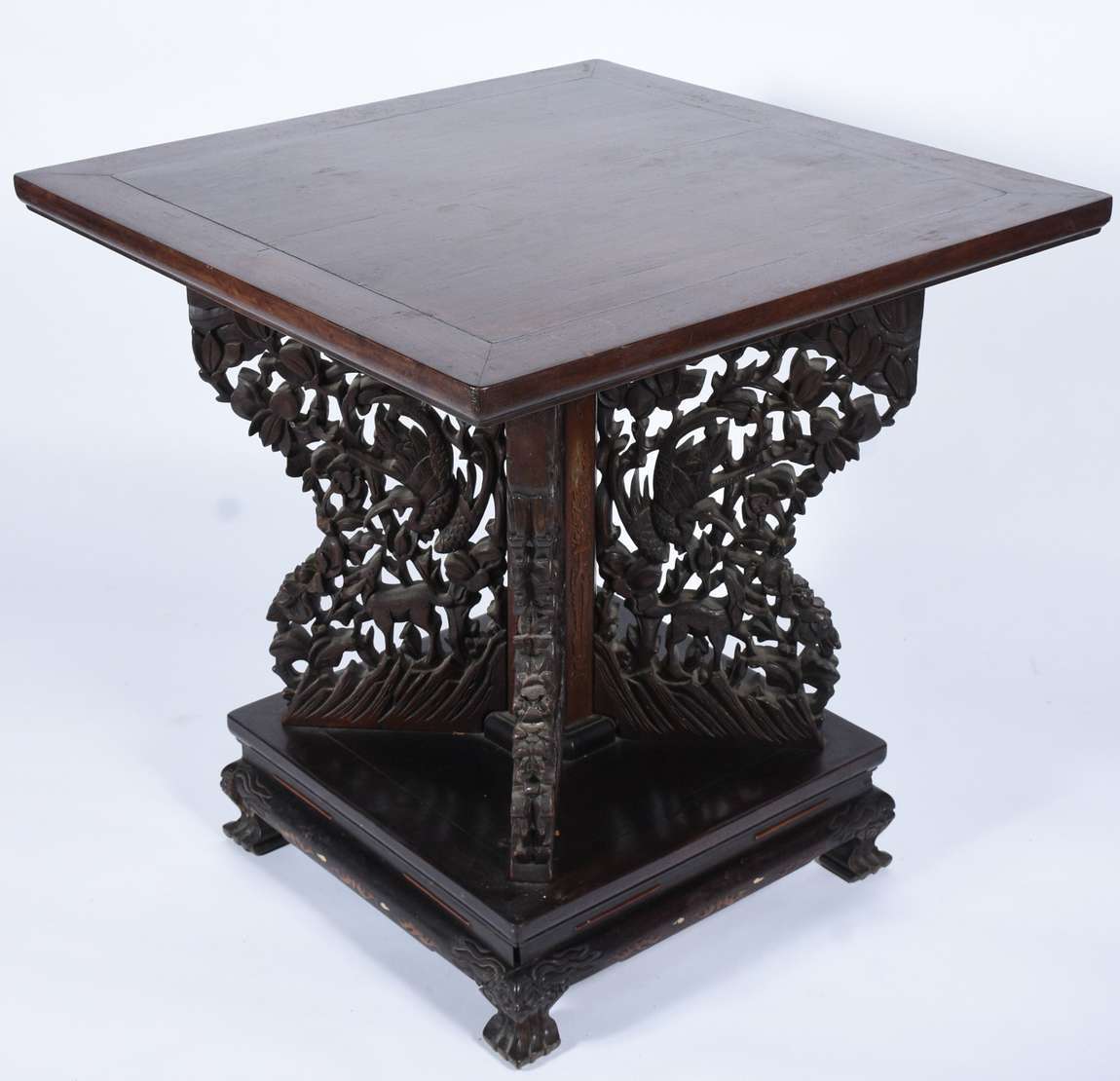 Mesa auxiliar de madeira nobre, tampo quadrangular apoiado em quatro pernas ricamente entalhadas com figuras de animais, base quadrada com pés de garra. Tampo recoberto por vidro bisotado. Pequenos desgastes.