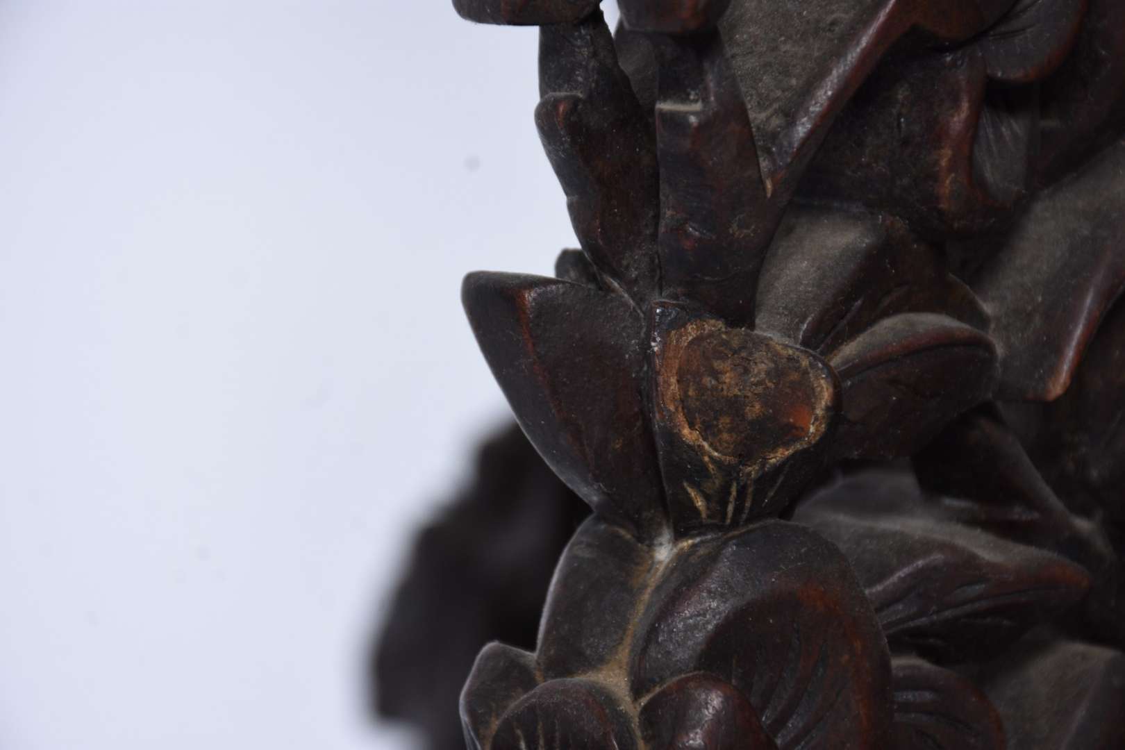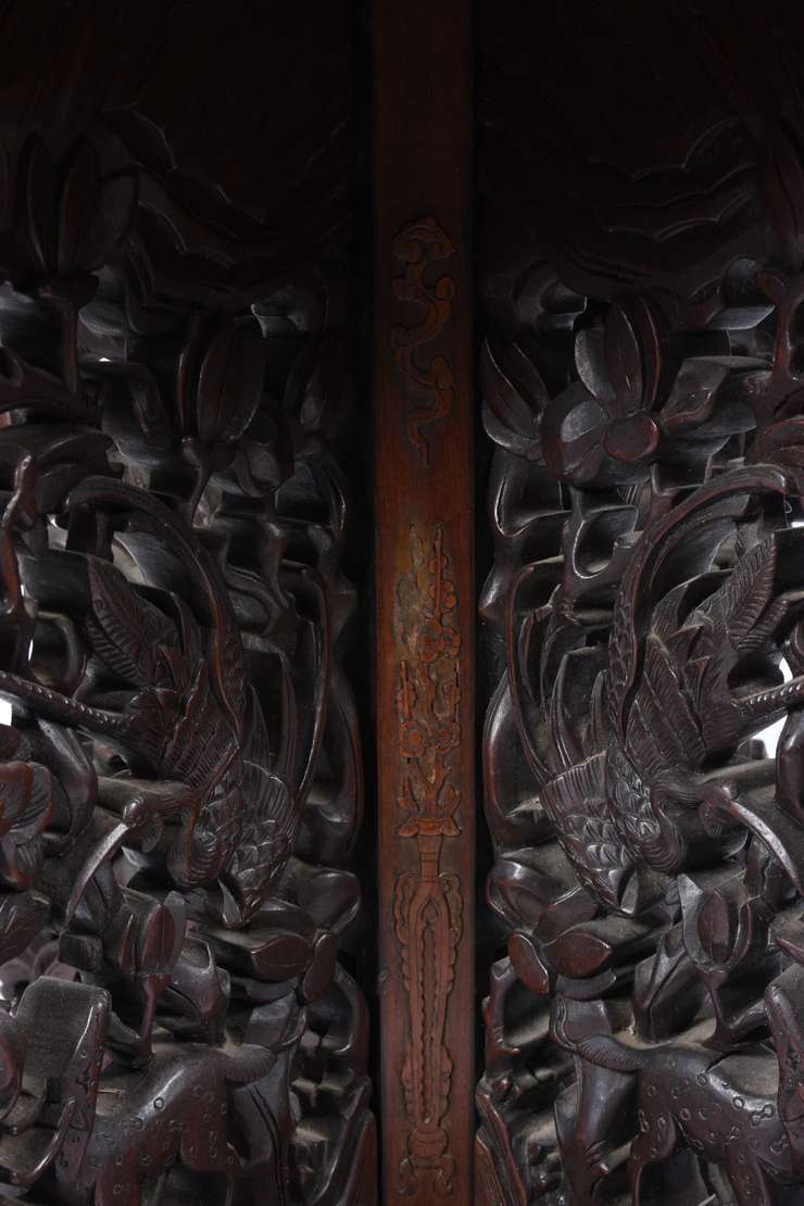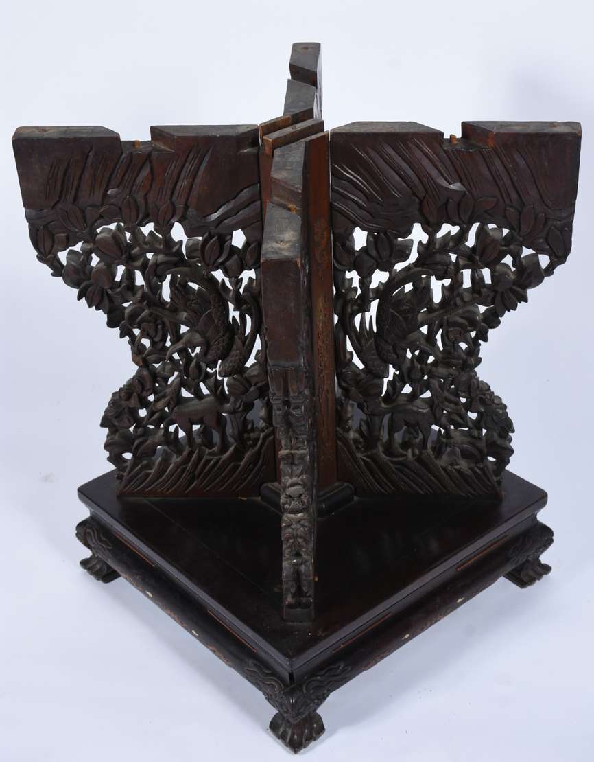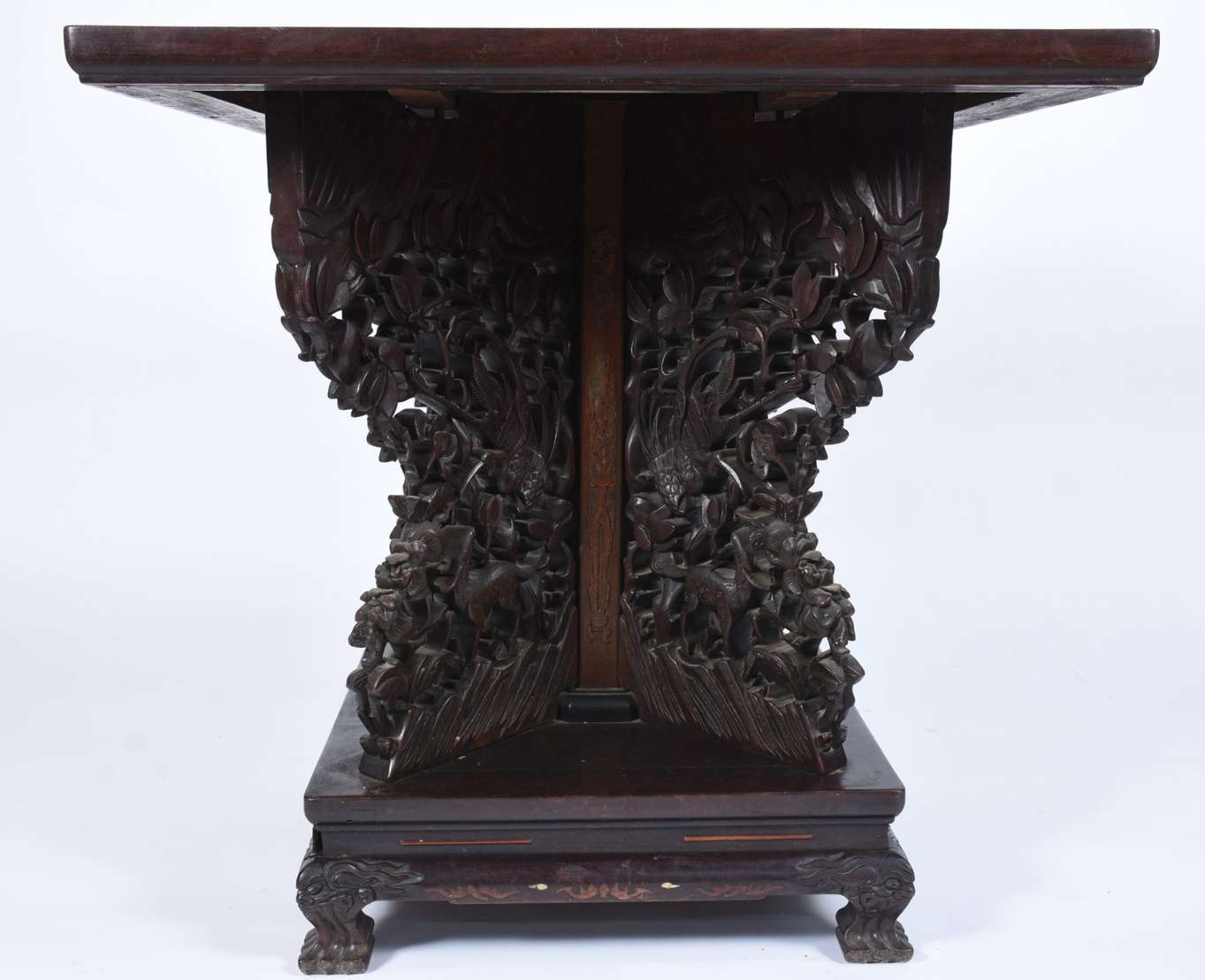 Mesa auxiliar de madeira nobre, tampo quadrangular apoiado em quatro pernas ricamente entalhadas com figuras de animais, base quadrada com pés de garra. Tampo recoberto por vidro bisotado. Pequenos desgastes.