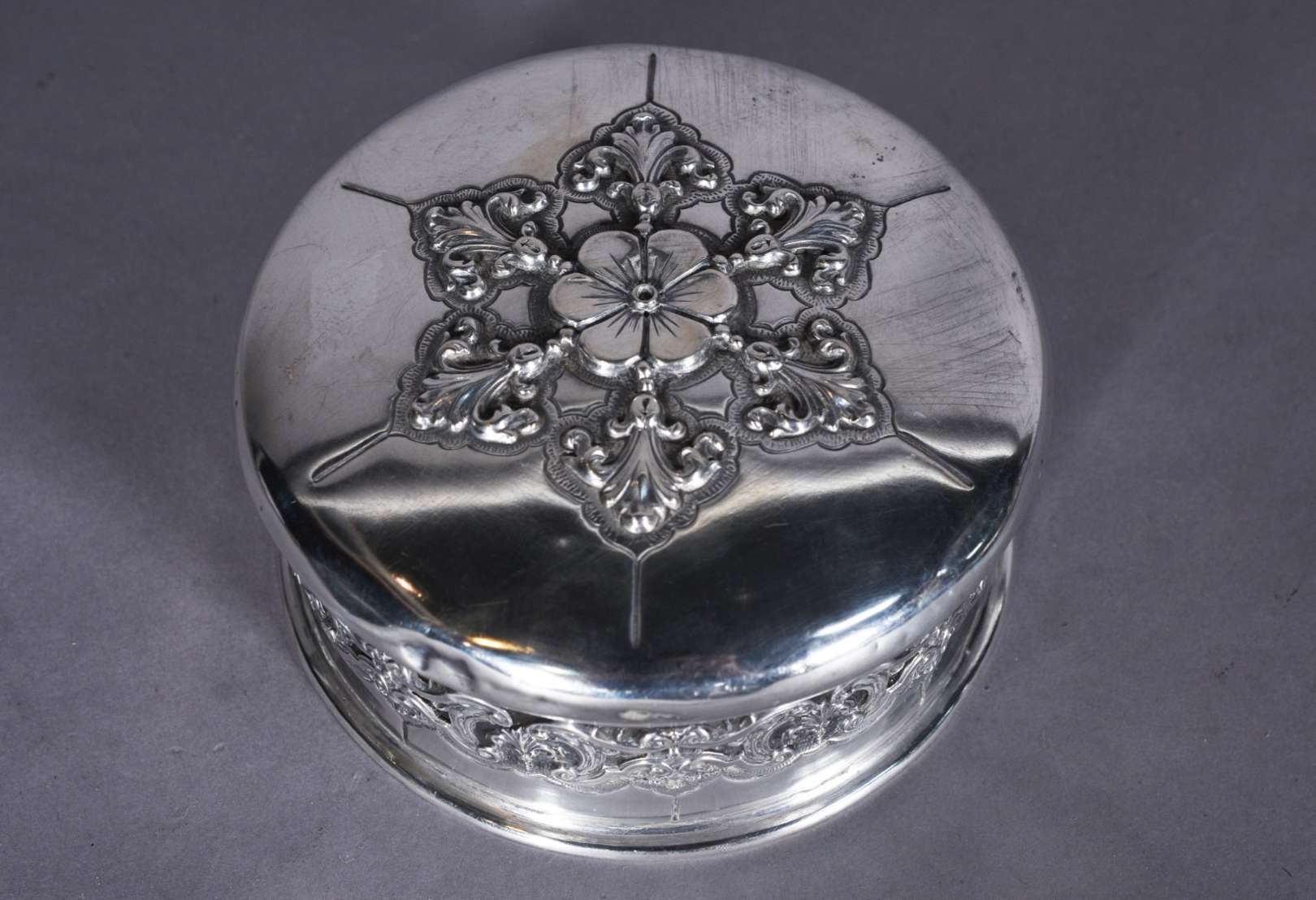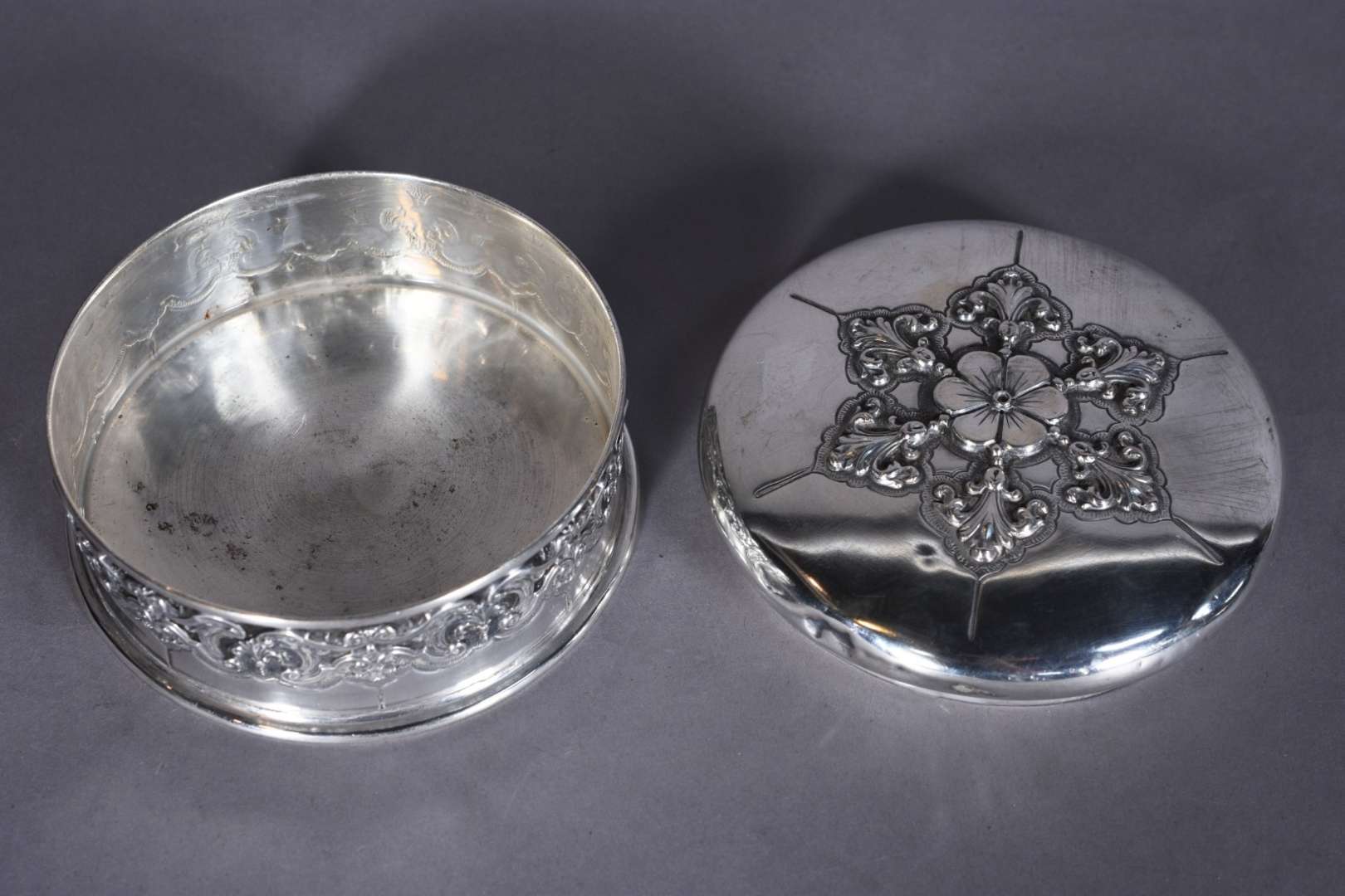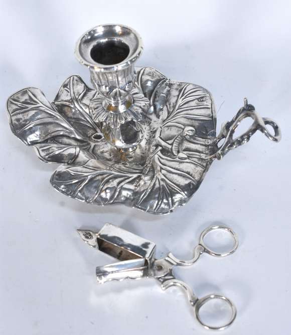 Palmatória com tesoura para cortar pavio de vela de prata contrastada. Peso da prata: 220 g (Por motivos de segurança...