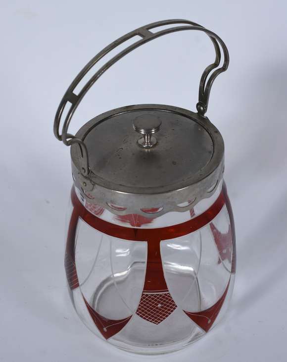 Bomboniere de vidro com detalhes em vermelho, Art Deco, alça e tampa de metal WMF. Pequenos amassados na tampa. Desga...