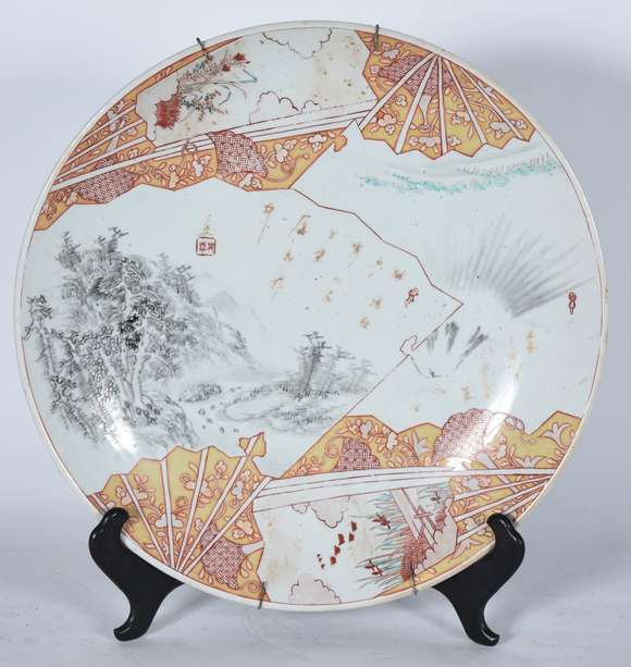 "Grande e raro medalhão em porcelana japonesa, decorado em “grisaille” e esmaltes policromados. Apresenta reservas re...