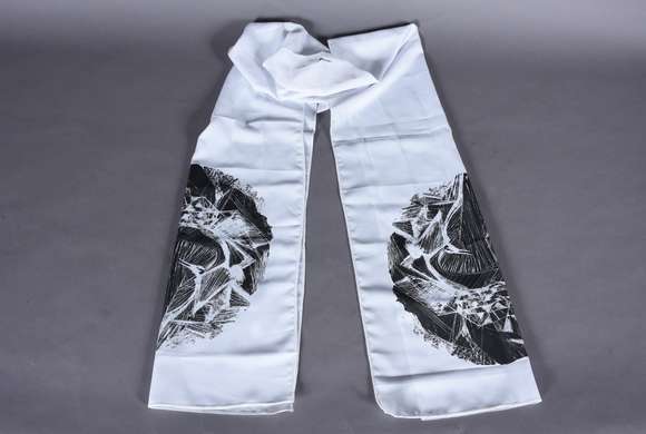 Écharpe em tecido branco com estampa assinada pela artista.