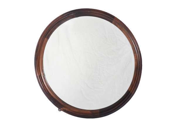 Espelho redondo de cristal bisotado com moldura de jacarandá.