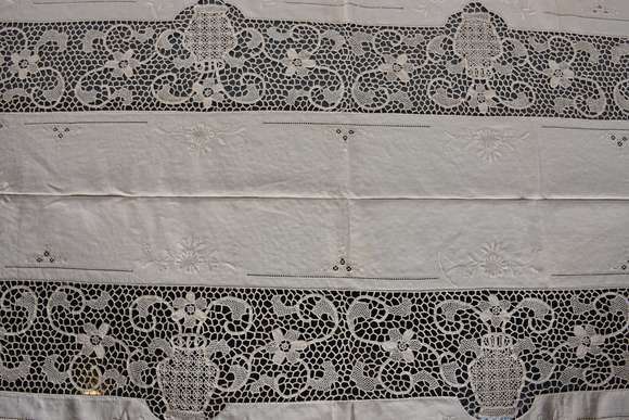 Toalha de mesa de linho e rendas na cor bege. Acompanham 12 guardanapos. Manchas.
