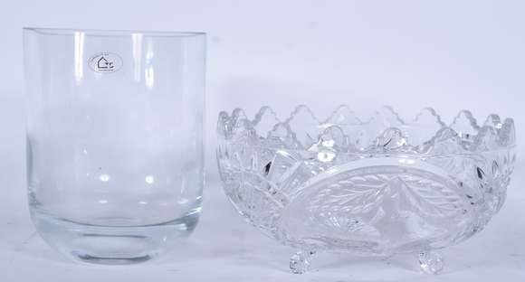 Duas peças de cristal, sendo vaso redondo liso e fruteira com borda recortada.