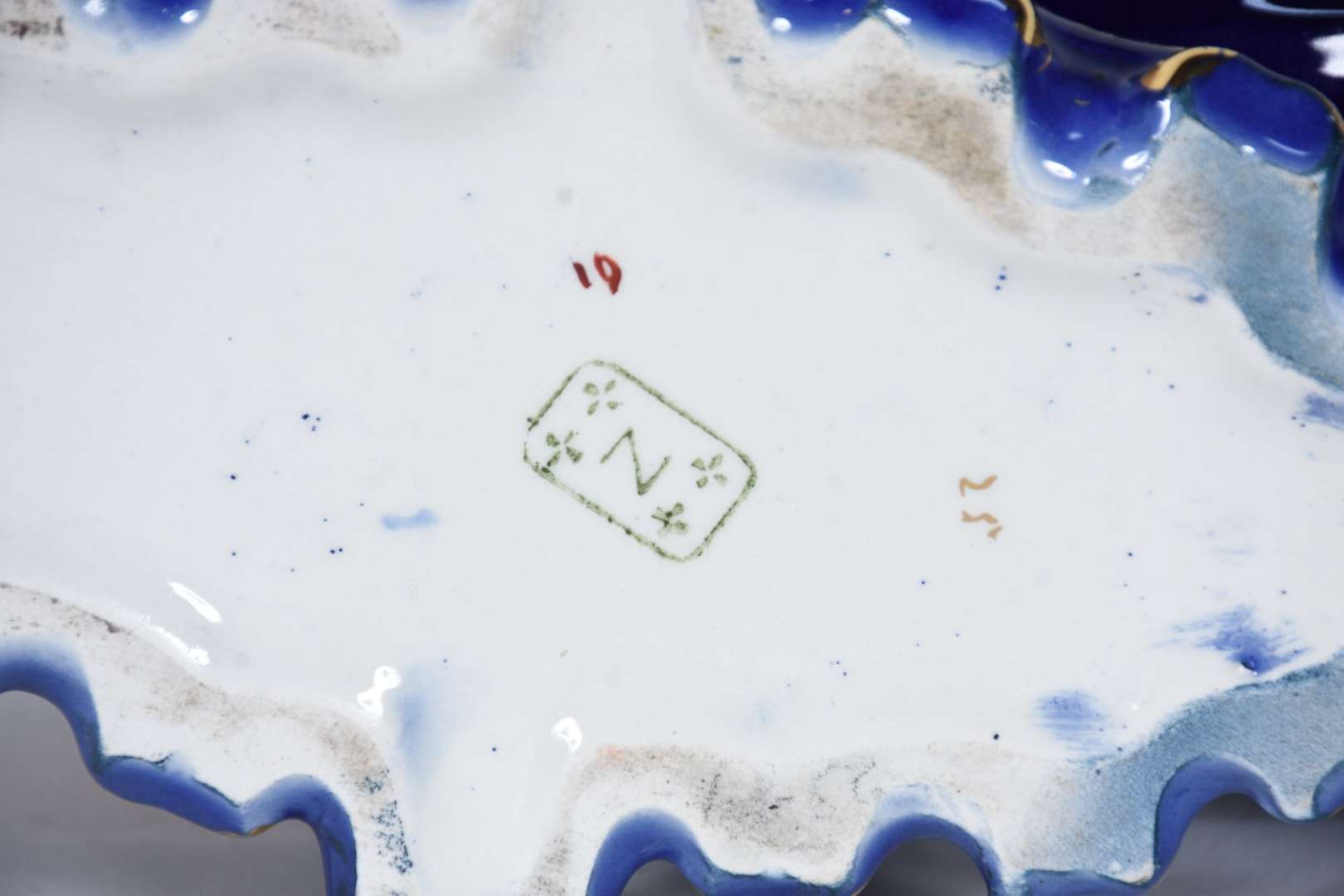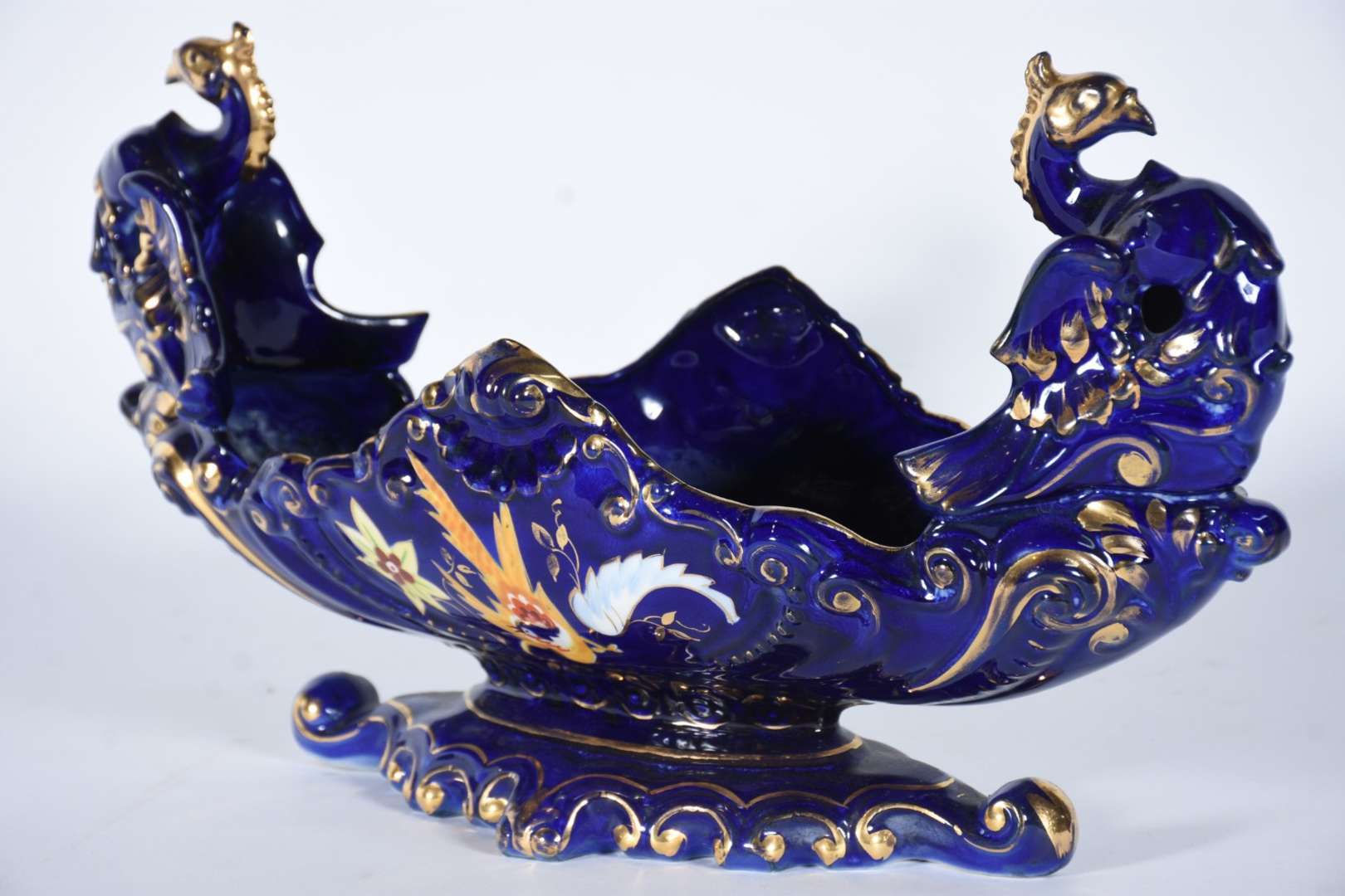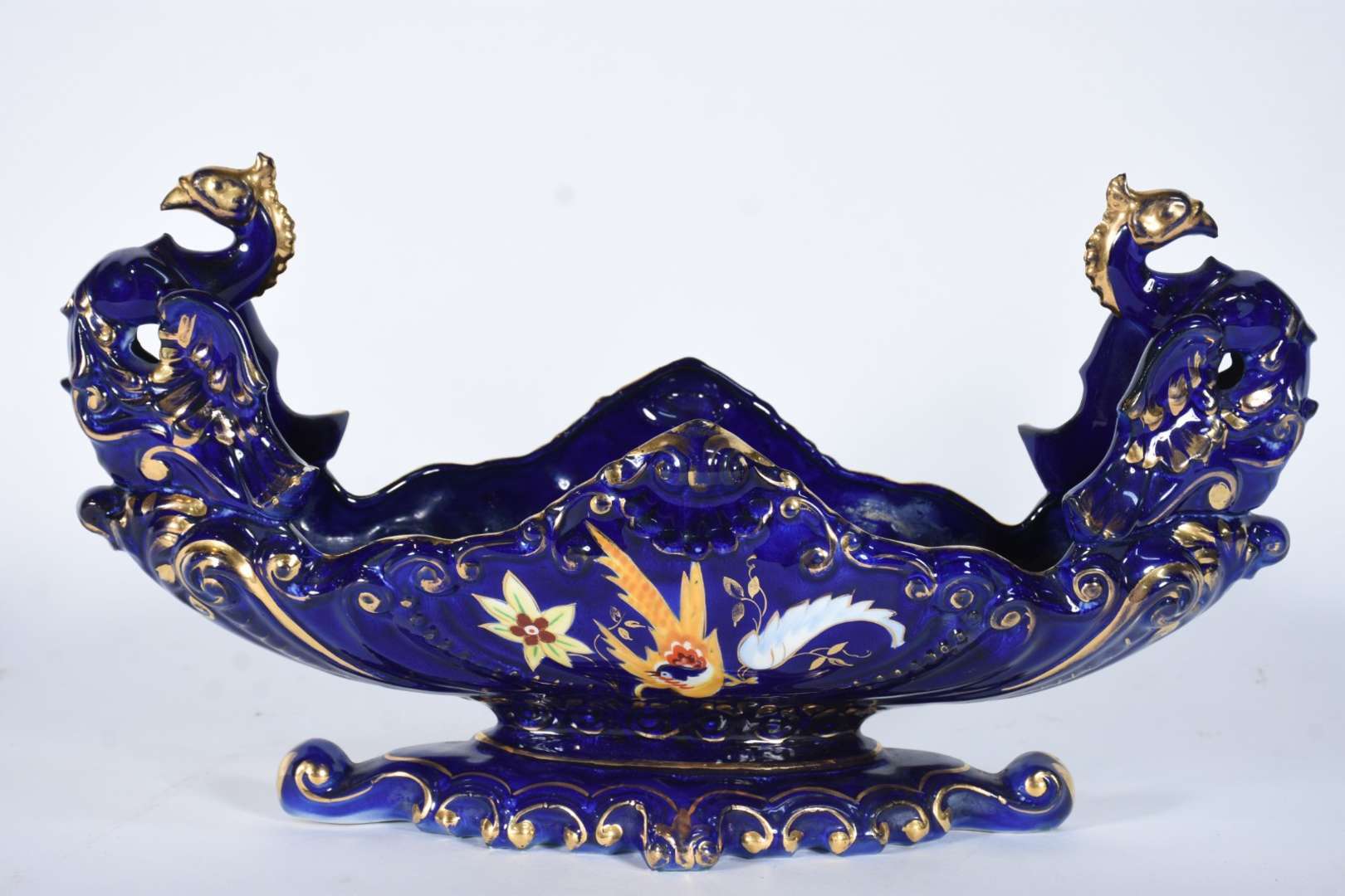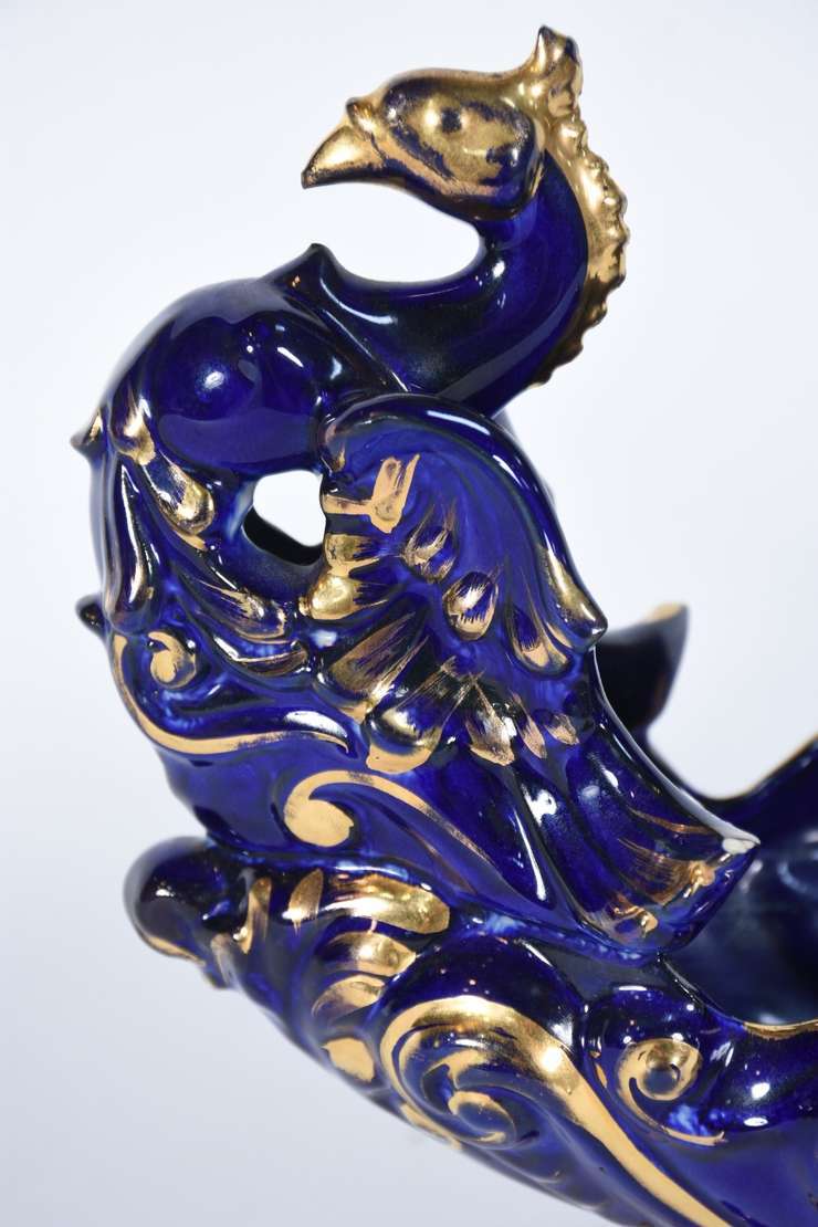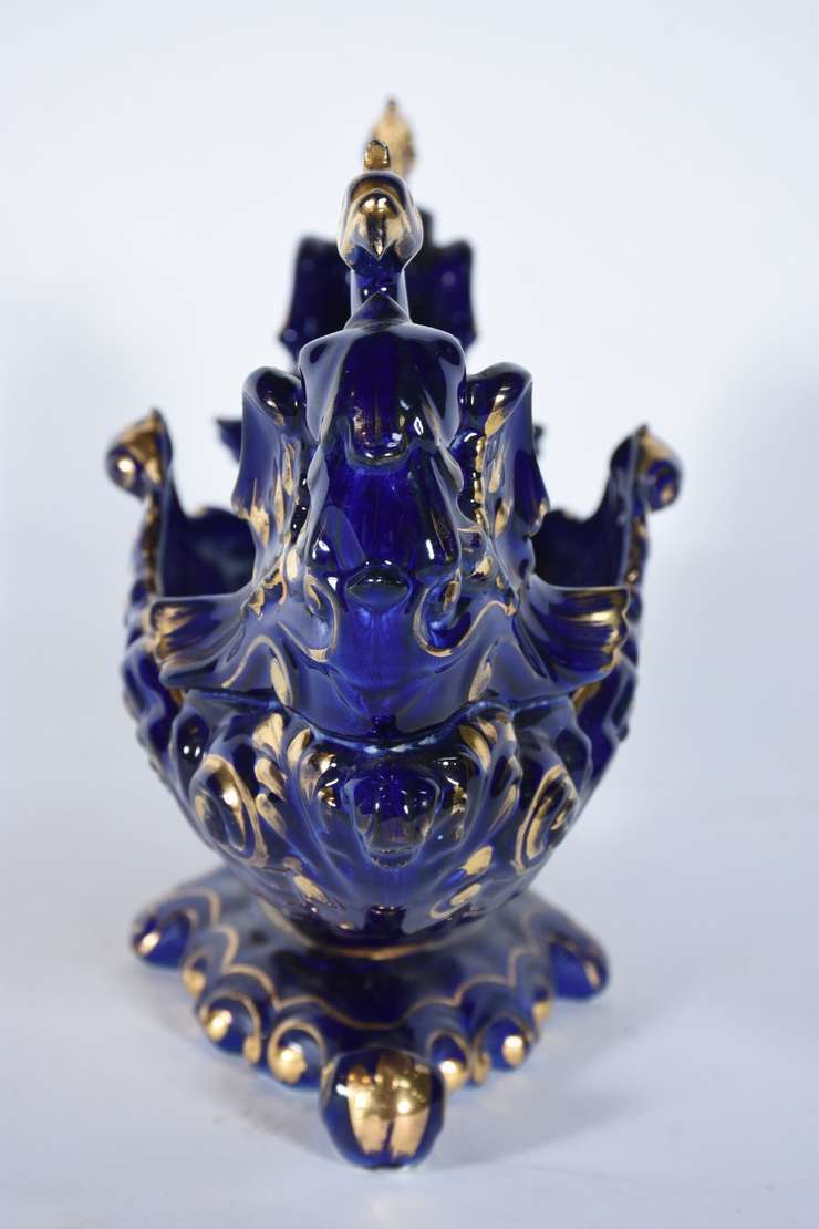 Aparelho de jantar de porcelana francesa, borda trabalhada com guirlandas douradas e friso azul cobalto sobre fundo b...