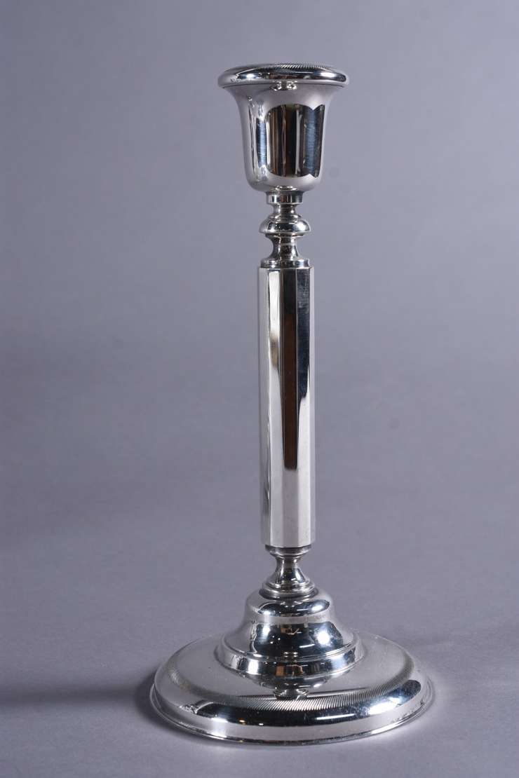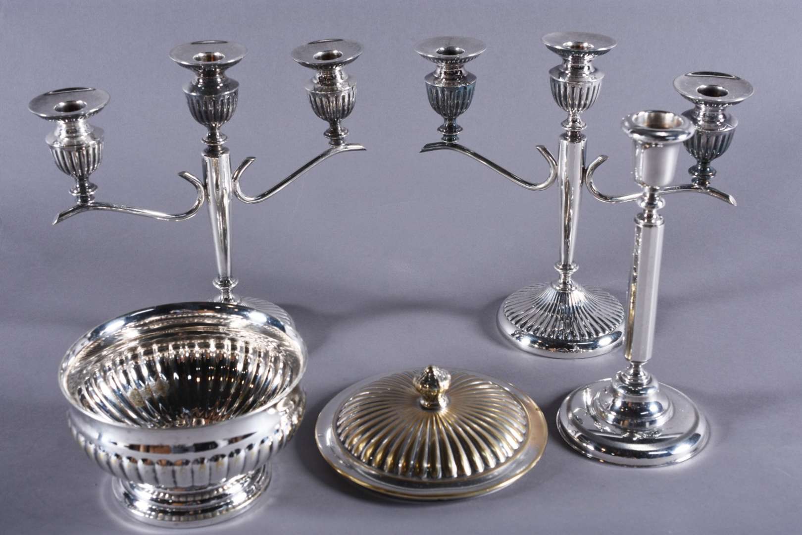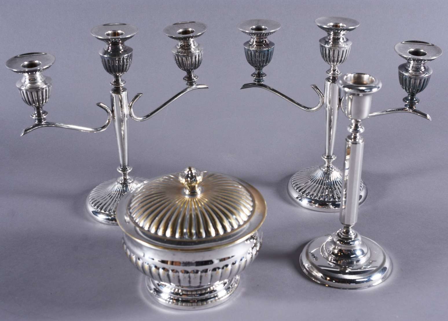 Diversas peças de metal prateado, sendo: par de castiçais; porta confeitos com dois recipientes de vidro; Seis taças ...