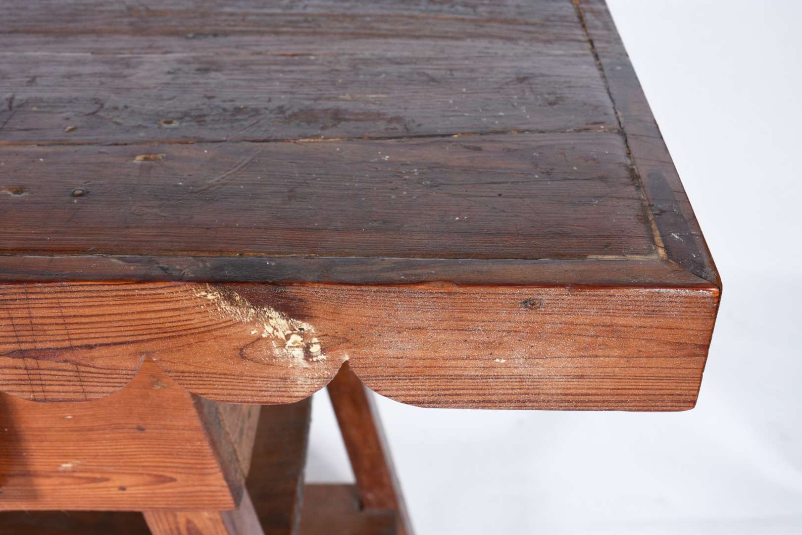 Mesa de madeira nobre feitio oitavado, saia entalhada, pernas torneadas ligadas por traves inferiores. Com desgastes.