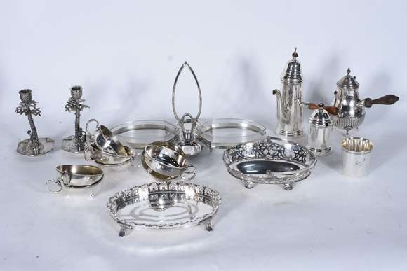 Salva de metal prateado, fundo cinzelado, borda com concheados em relevo, pés de garra.