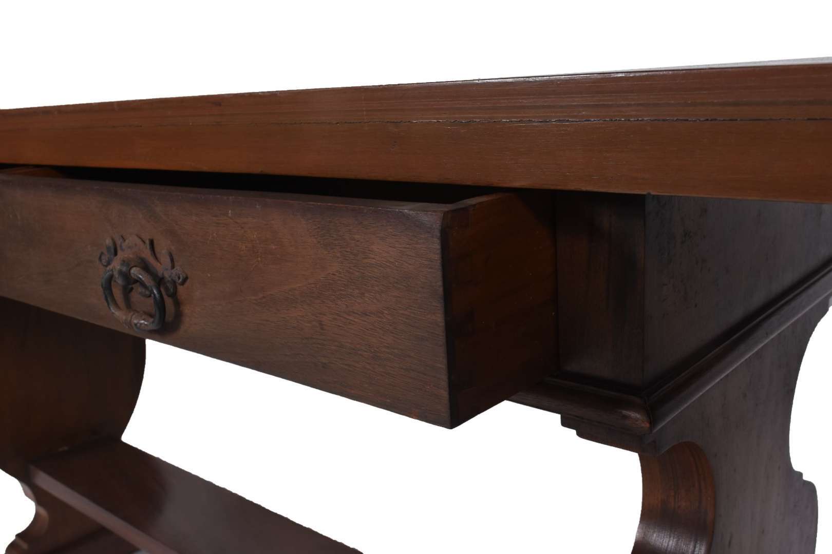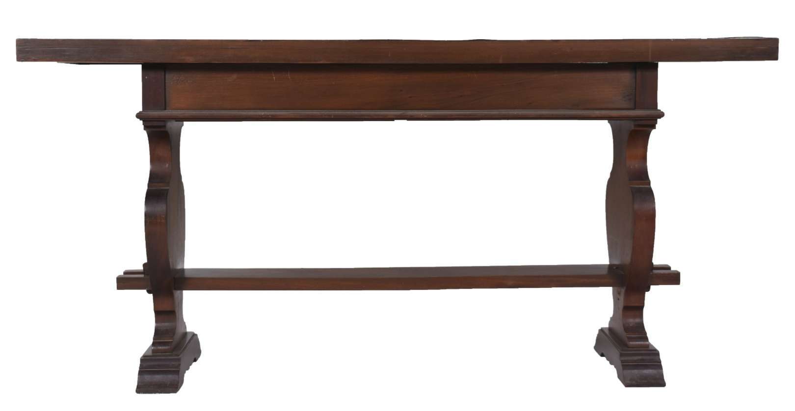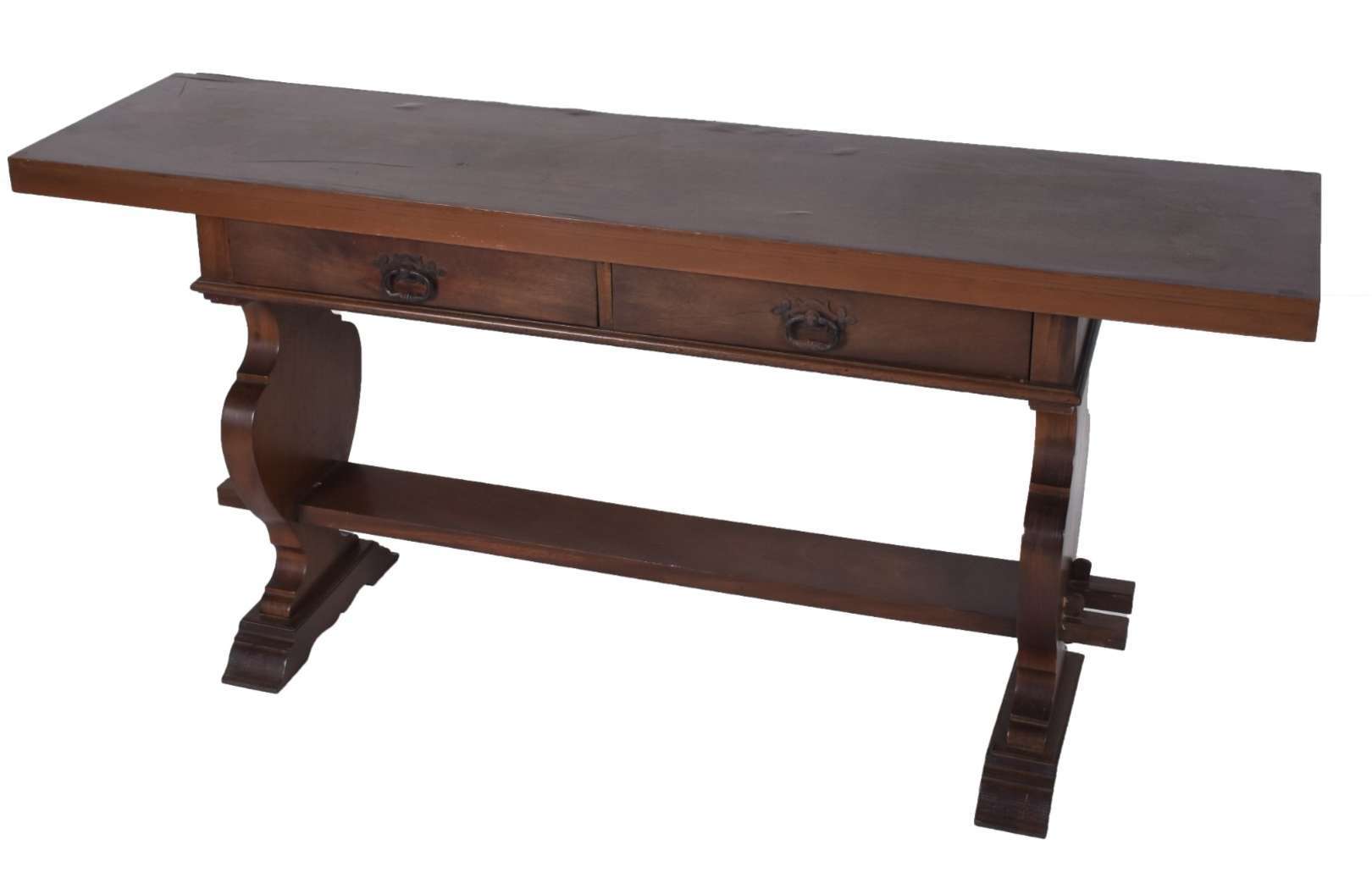 Mesa/aparador de pinho de riga, tampo retangular com saia recortada em gomos, uma gaveta com puxador de metal, duas p...