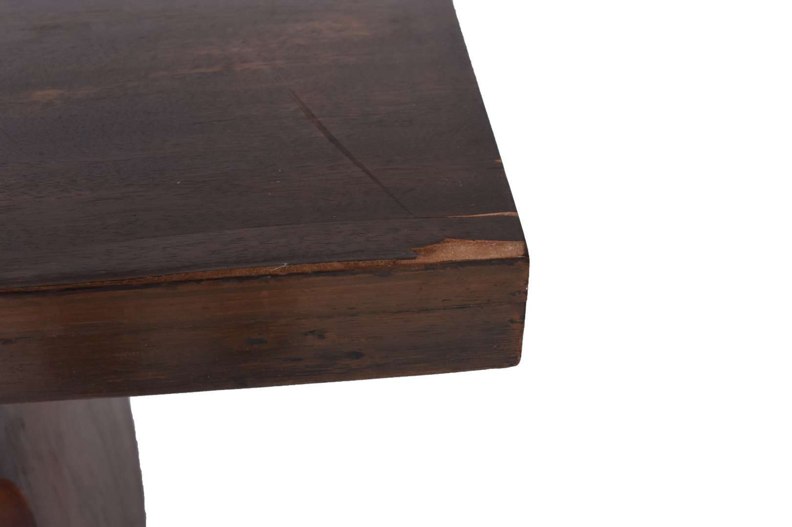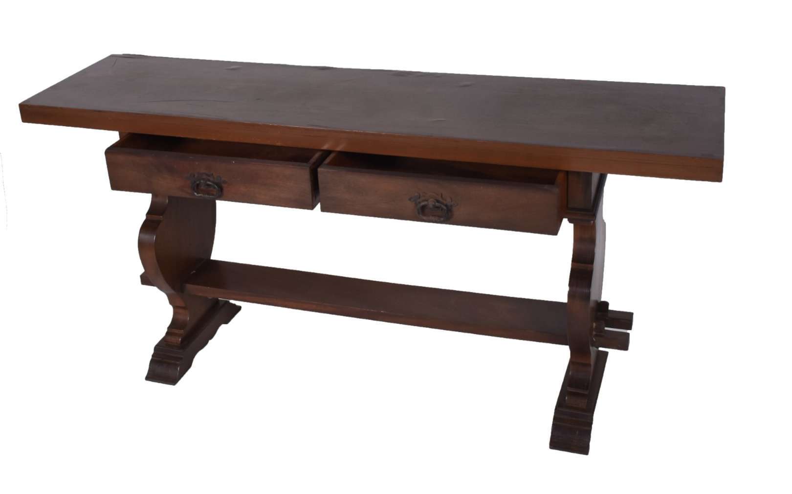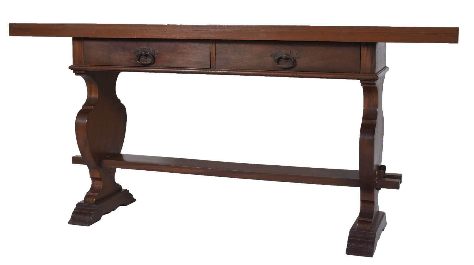 Aparador de madeira nobre, tampo retangular apoiado em duas pernas laterais recortadas, unidas por travessão central....