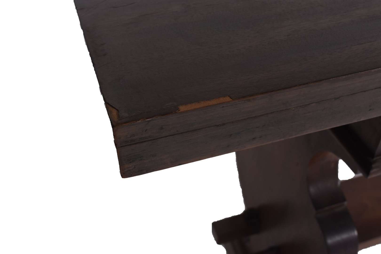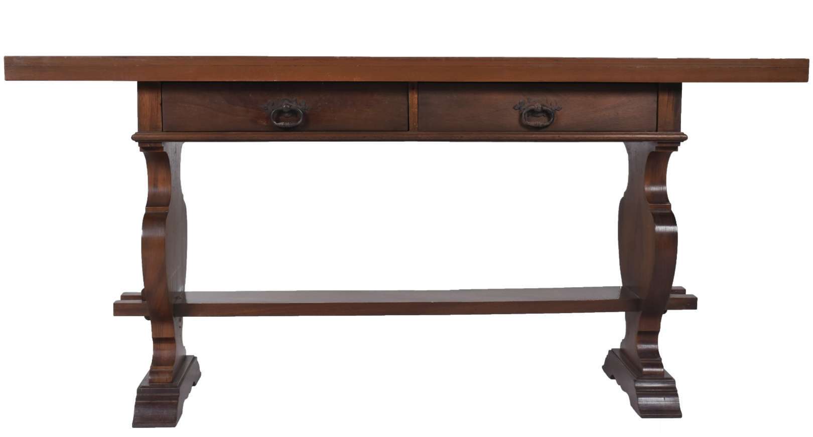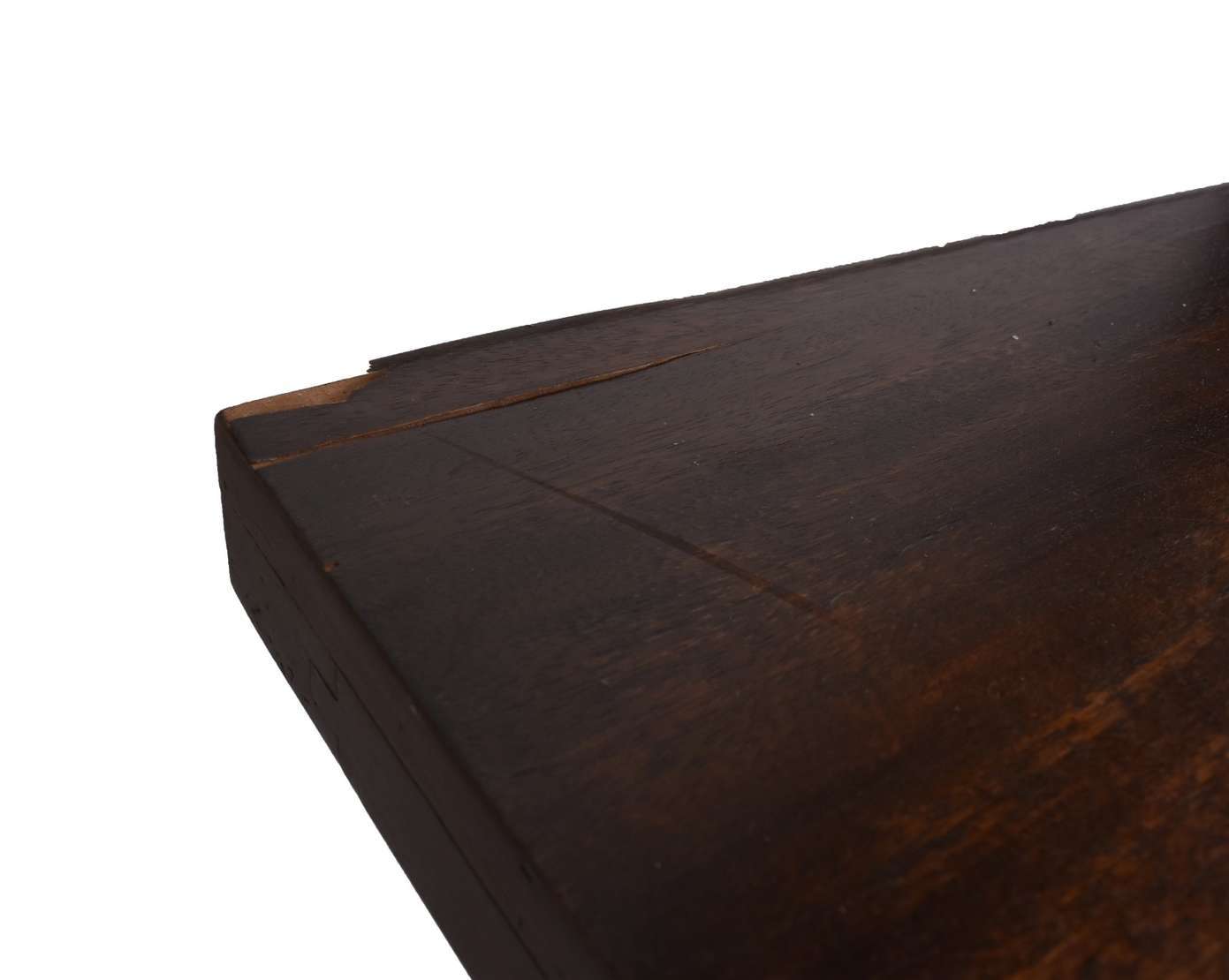 Aparador de madeira nobre, tampo retangular apoiado em duas pernas laterais recortadas, unidas por travessão central....