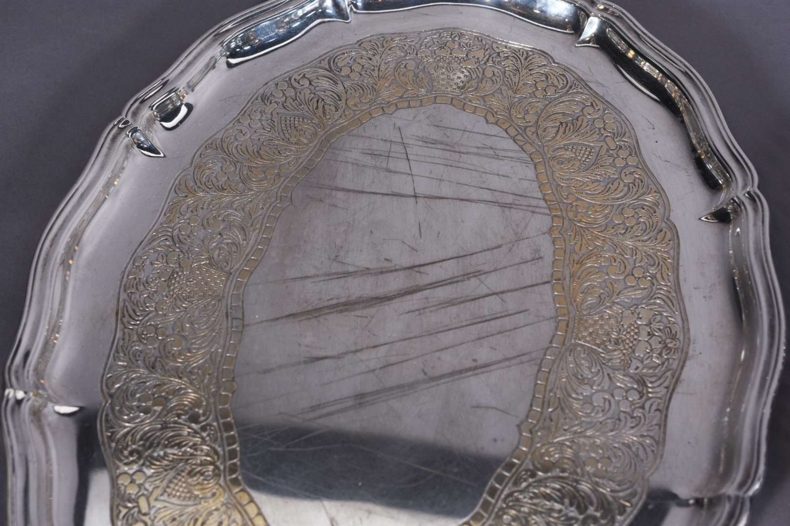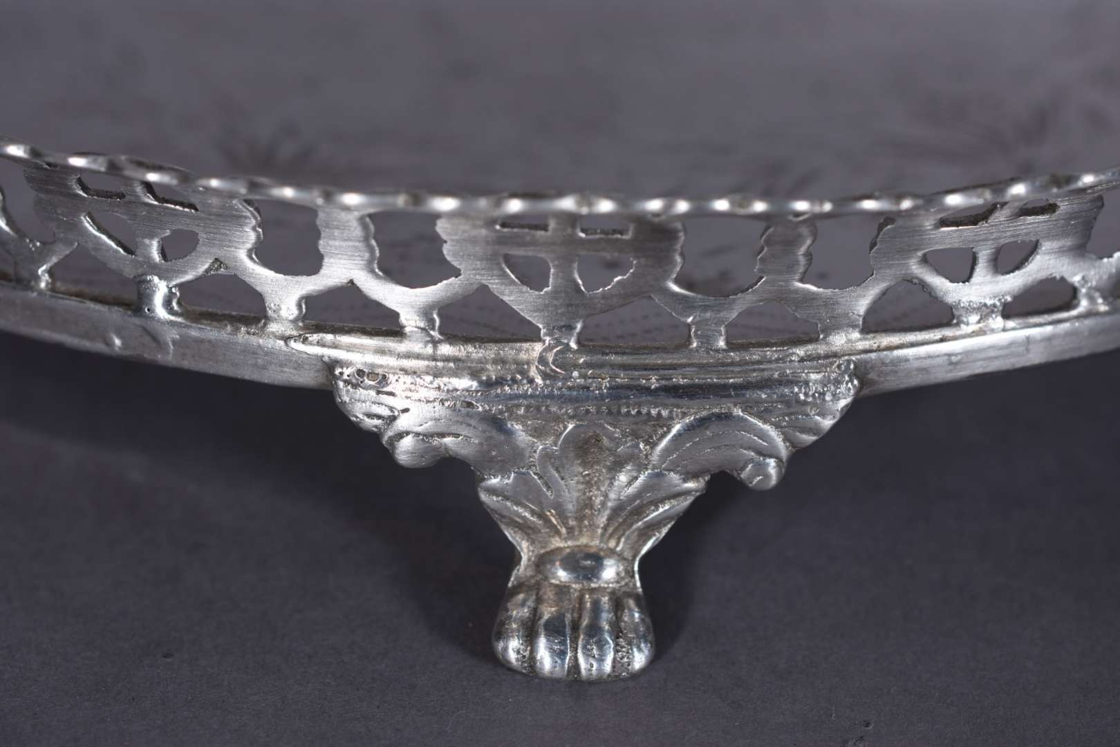 Salva de metal prateado, fundo cinzelado, borda com concheados em relevo, pés de garra.