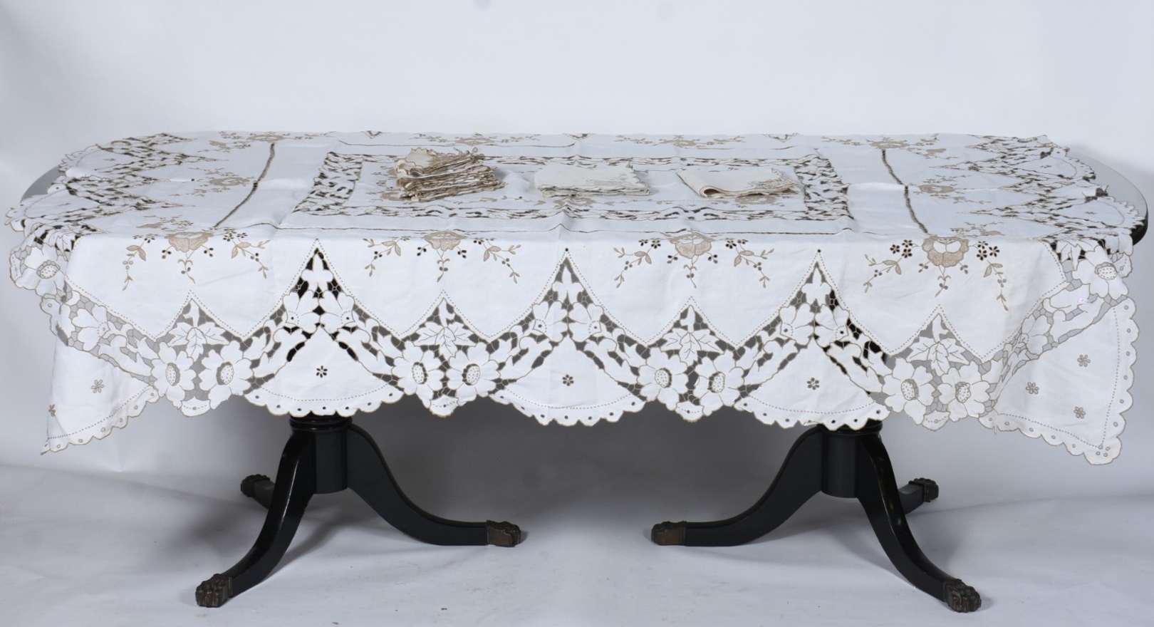 Aparelho de jantar de porcelana francesa, borda trabalhada com guirlandas douradas e friso azul cobalto sobre fundo b...
