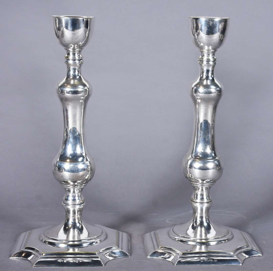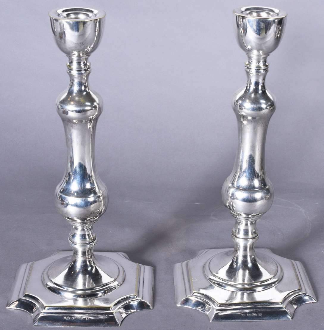 Par de candelabros de prata portuguesa contraste águia, para 3 velas cada, decorados com concheados em relevo. Peso d...