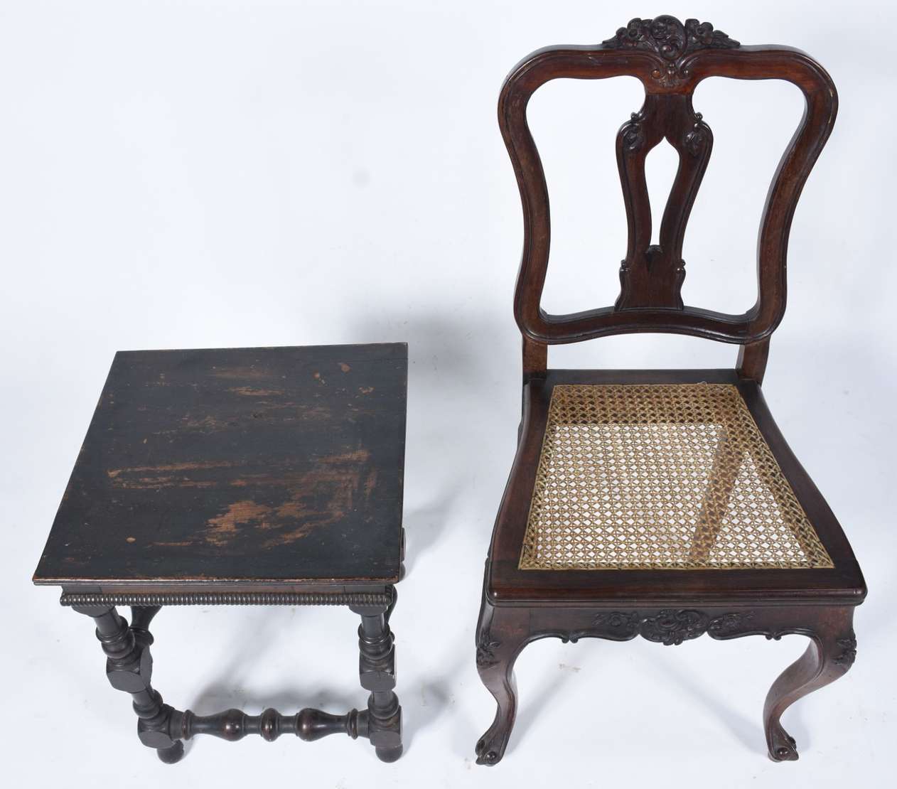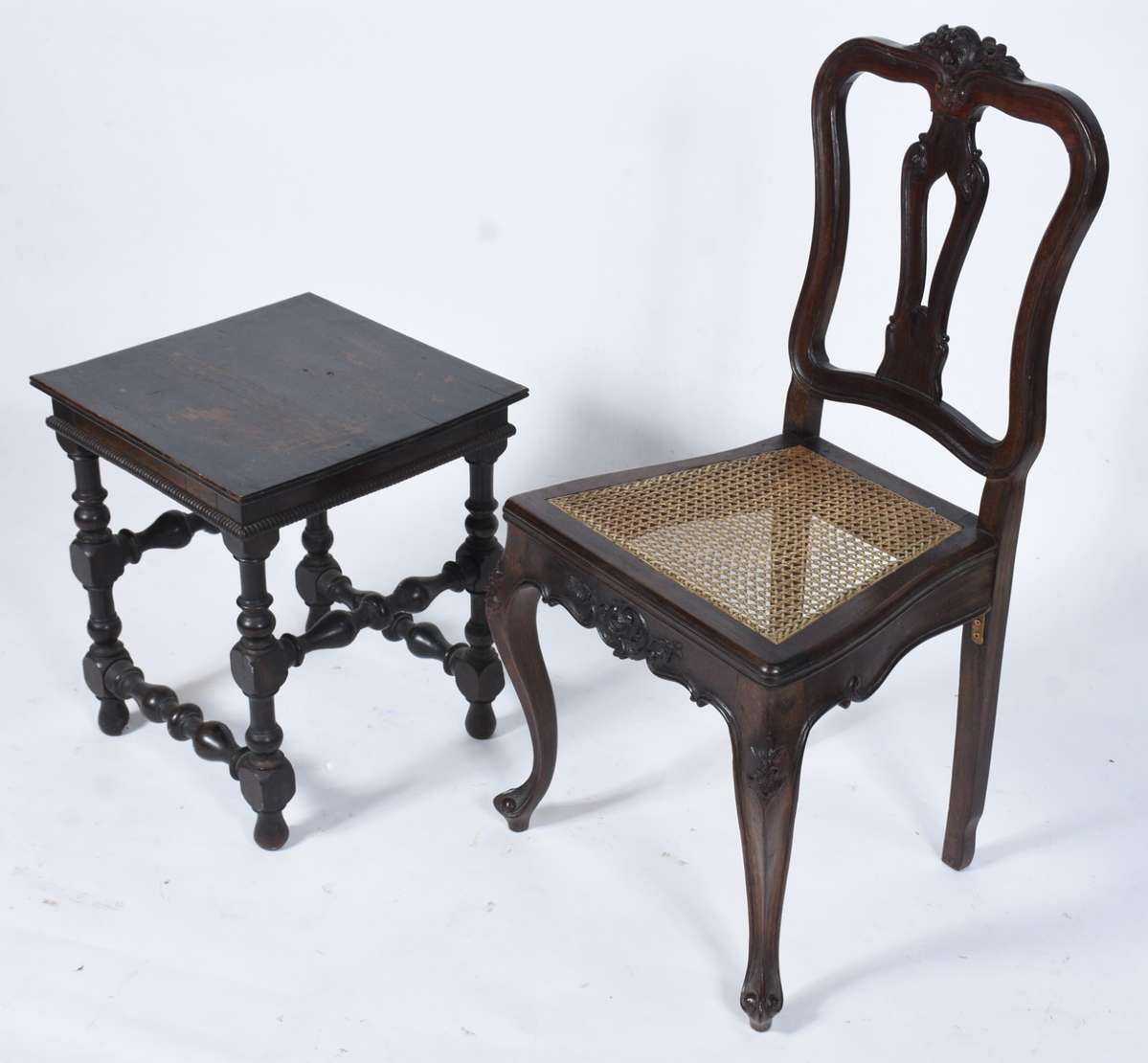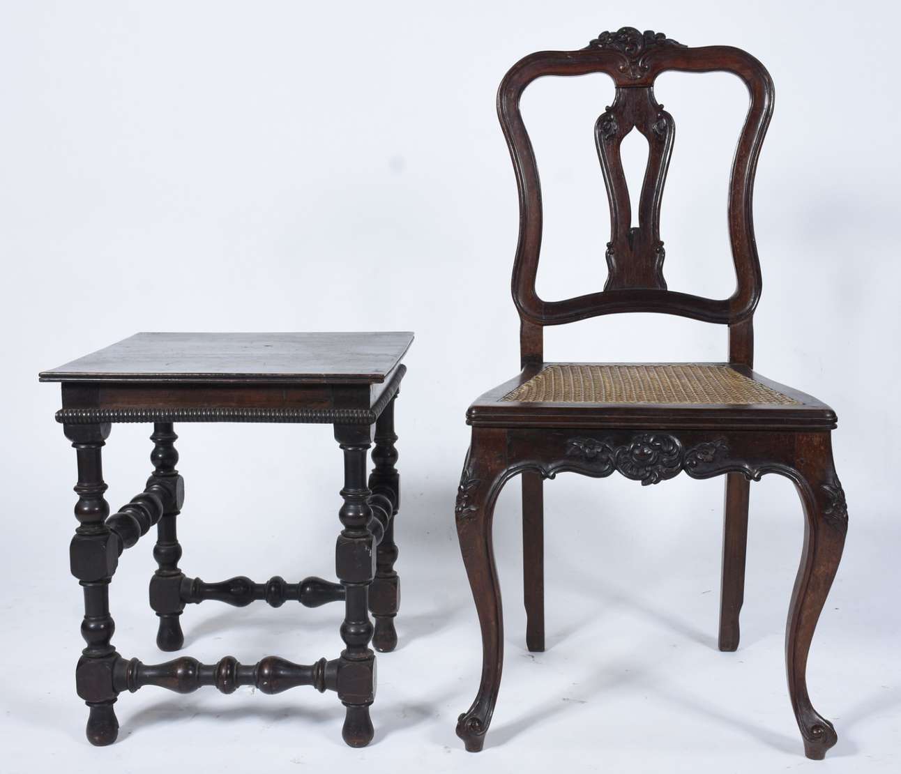 Mesa auxiliar de madeira nobre, tampo quadrangular apoiado em quatro pernas ricamente entalhadas com figuras de anima...