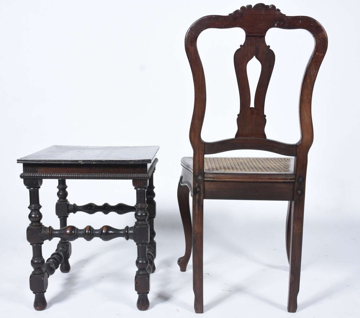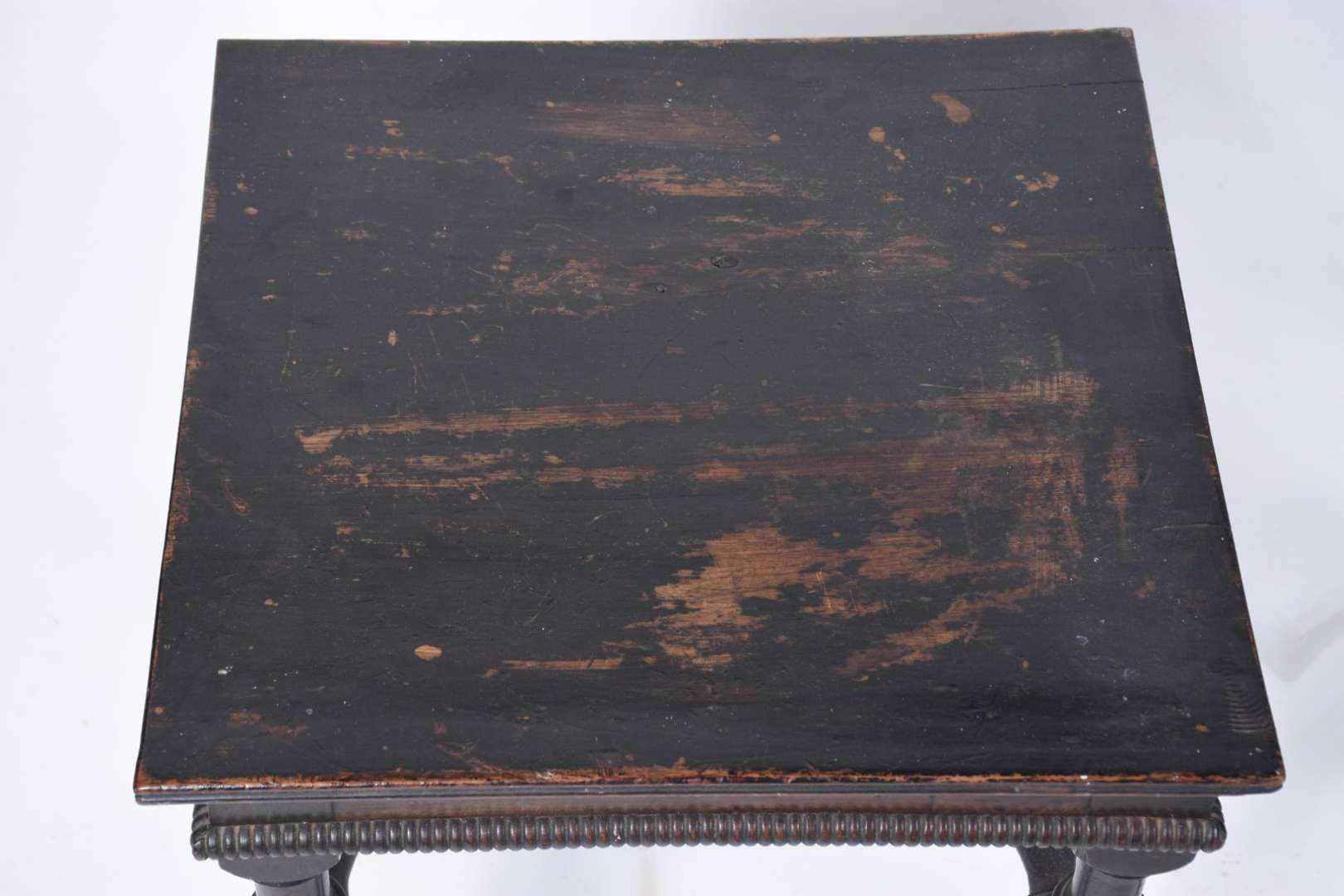 Mesa de madeira nobre feitio oitavado, saia entalhada, pernas torneadas ligadas por traves inferiores. Com desgastes.