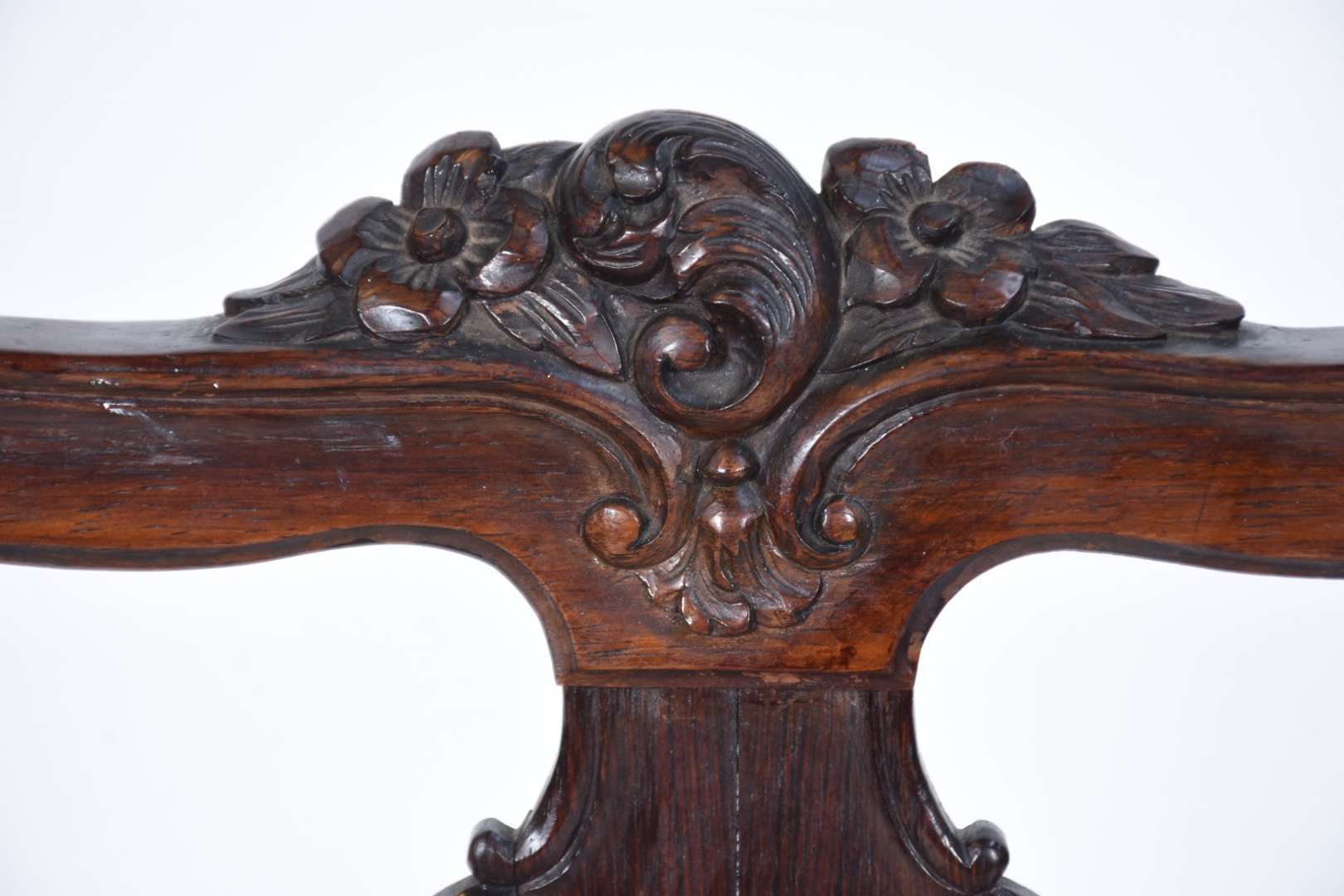 Par de cadeiras de madeira nobre, espaldares altos e entalhados, patinadas na cor azul.