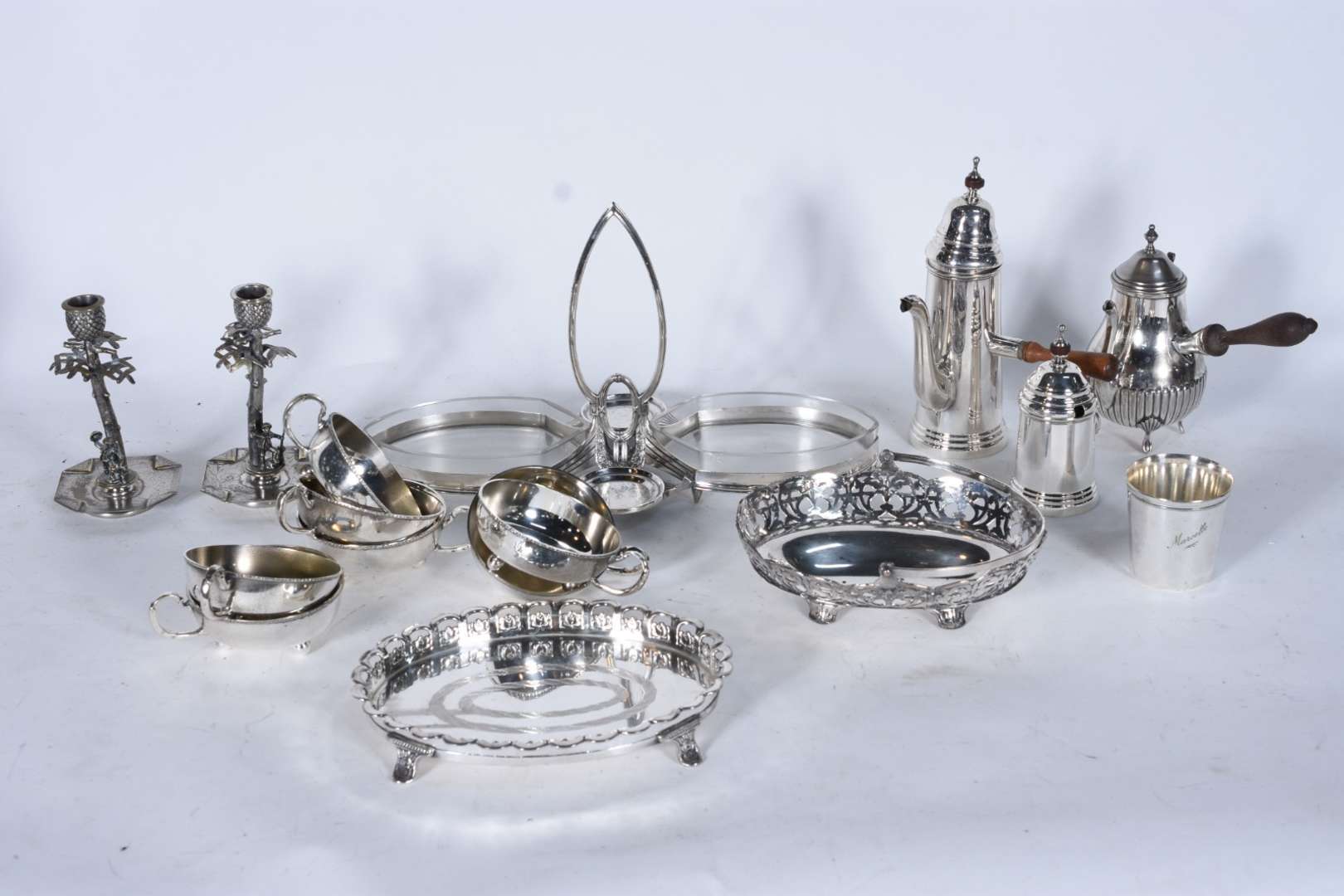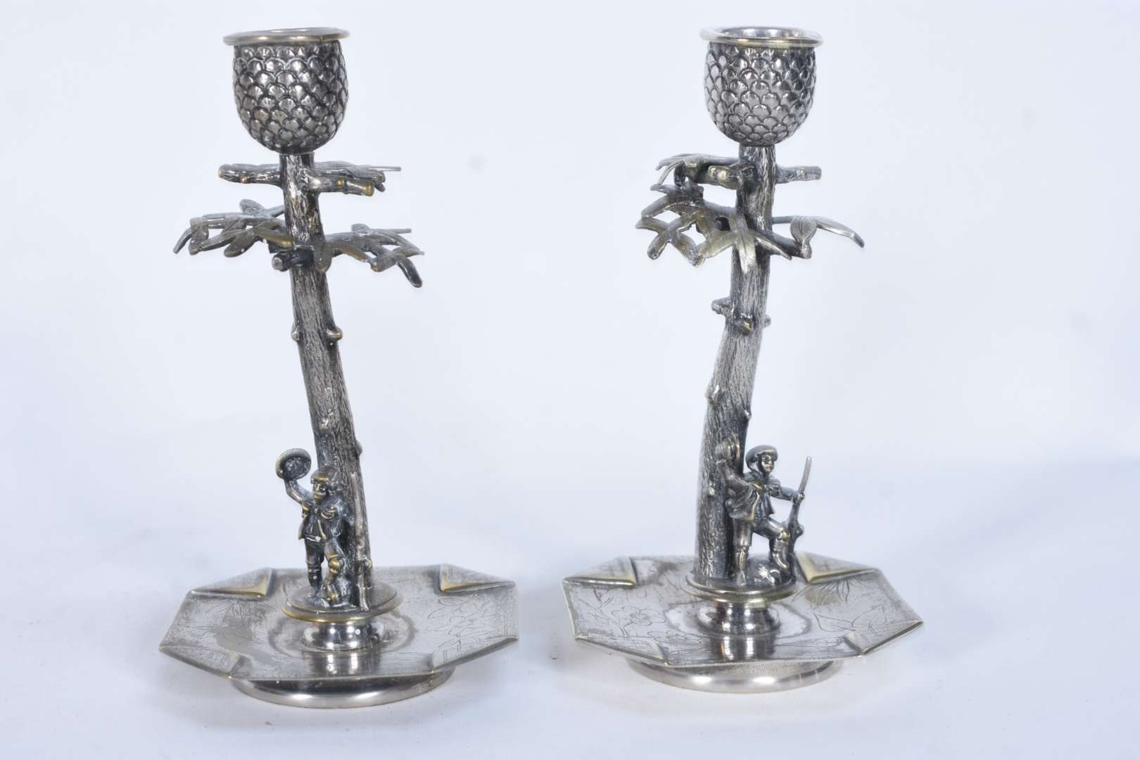 Diversas peças de metal prateado, sendo: par de candelabros, castiçal e bomboniere. Desgastes.