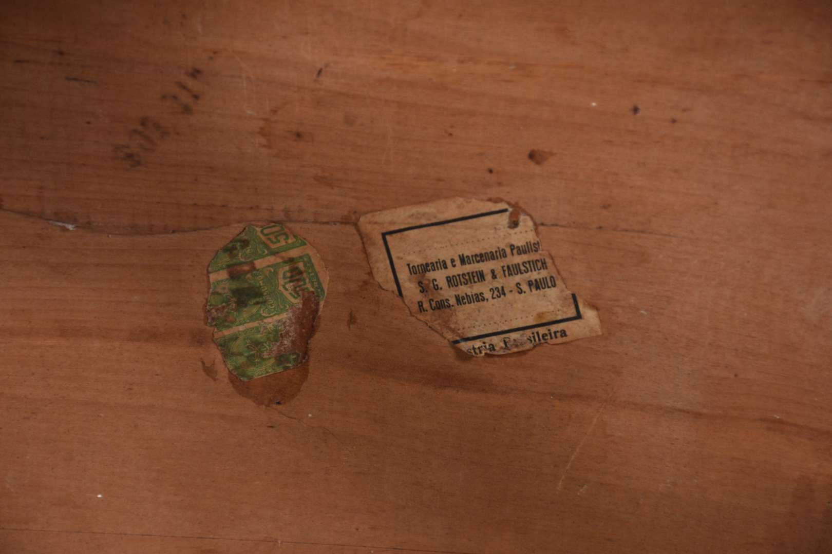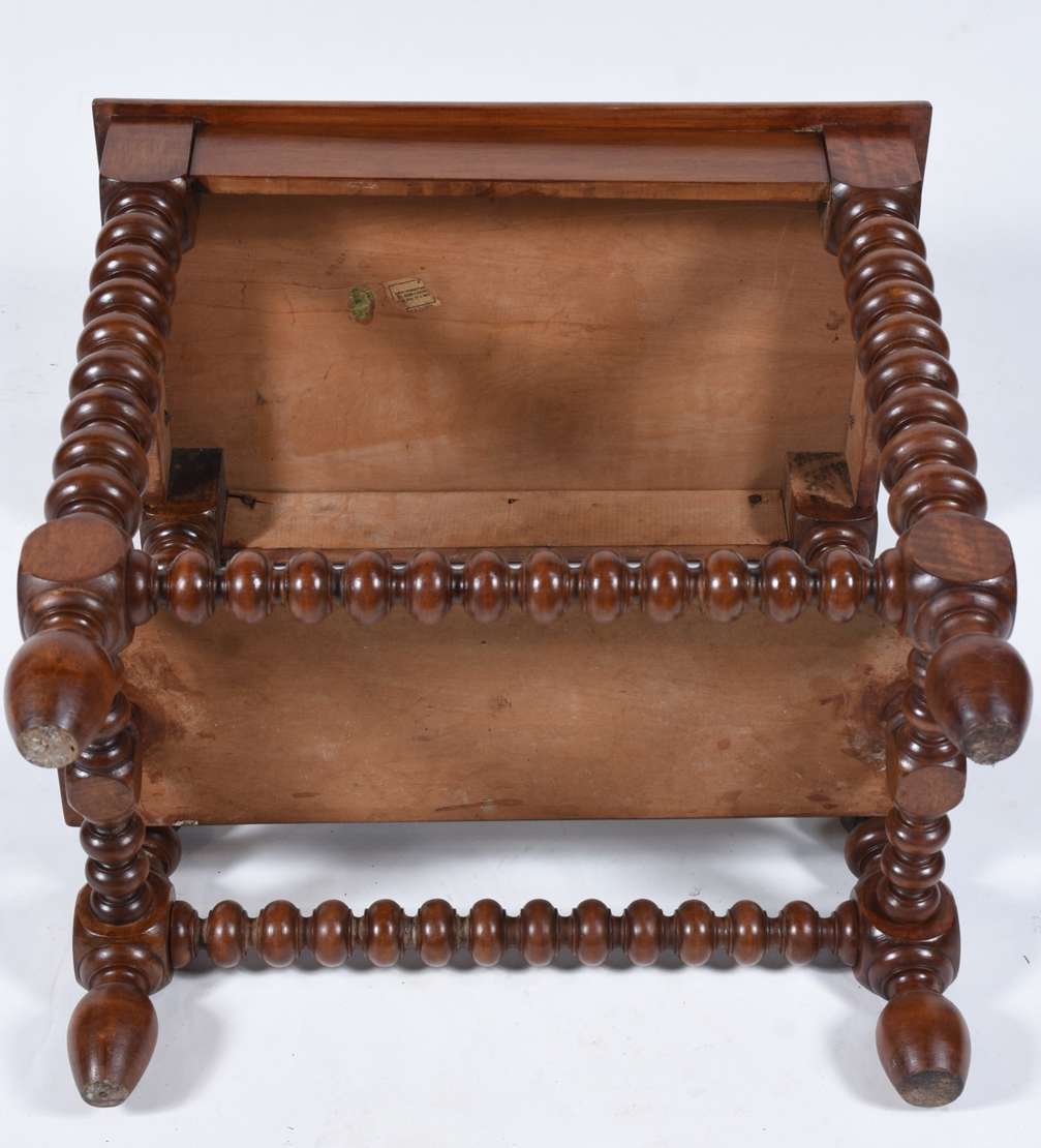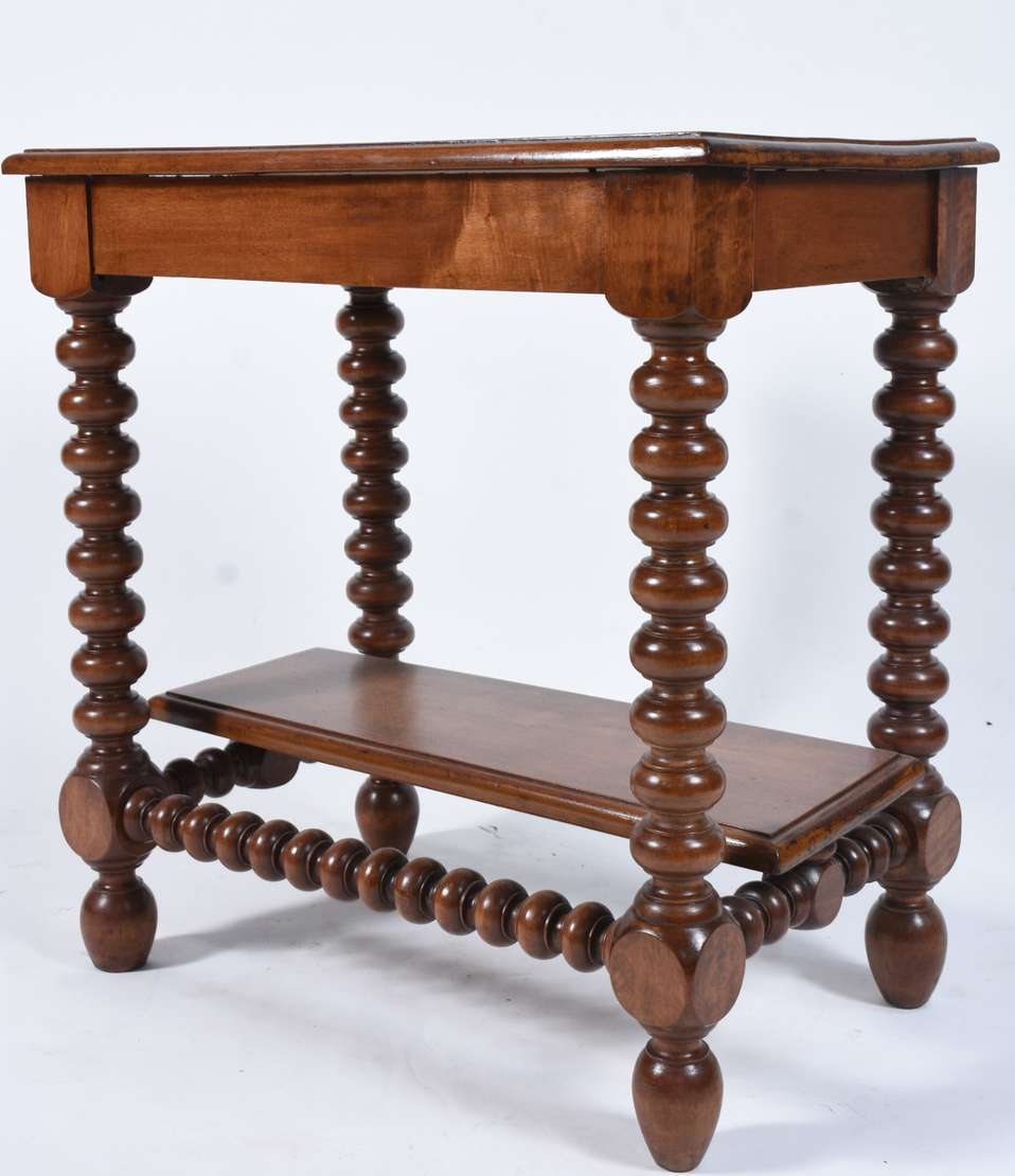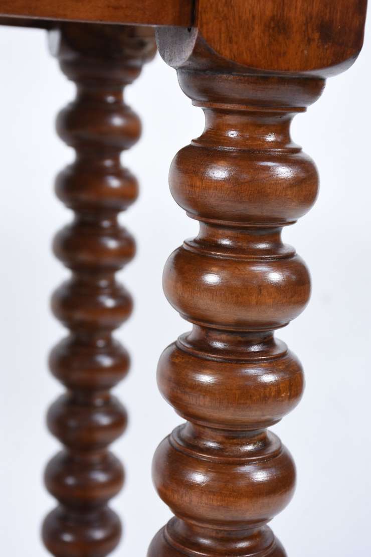 Mesa de madeira nobre feitio oitavado, saia entalhada, pernas torneadas ligadas por traves inferiores. Com desgastes.