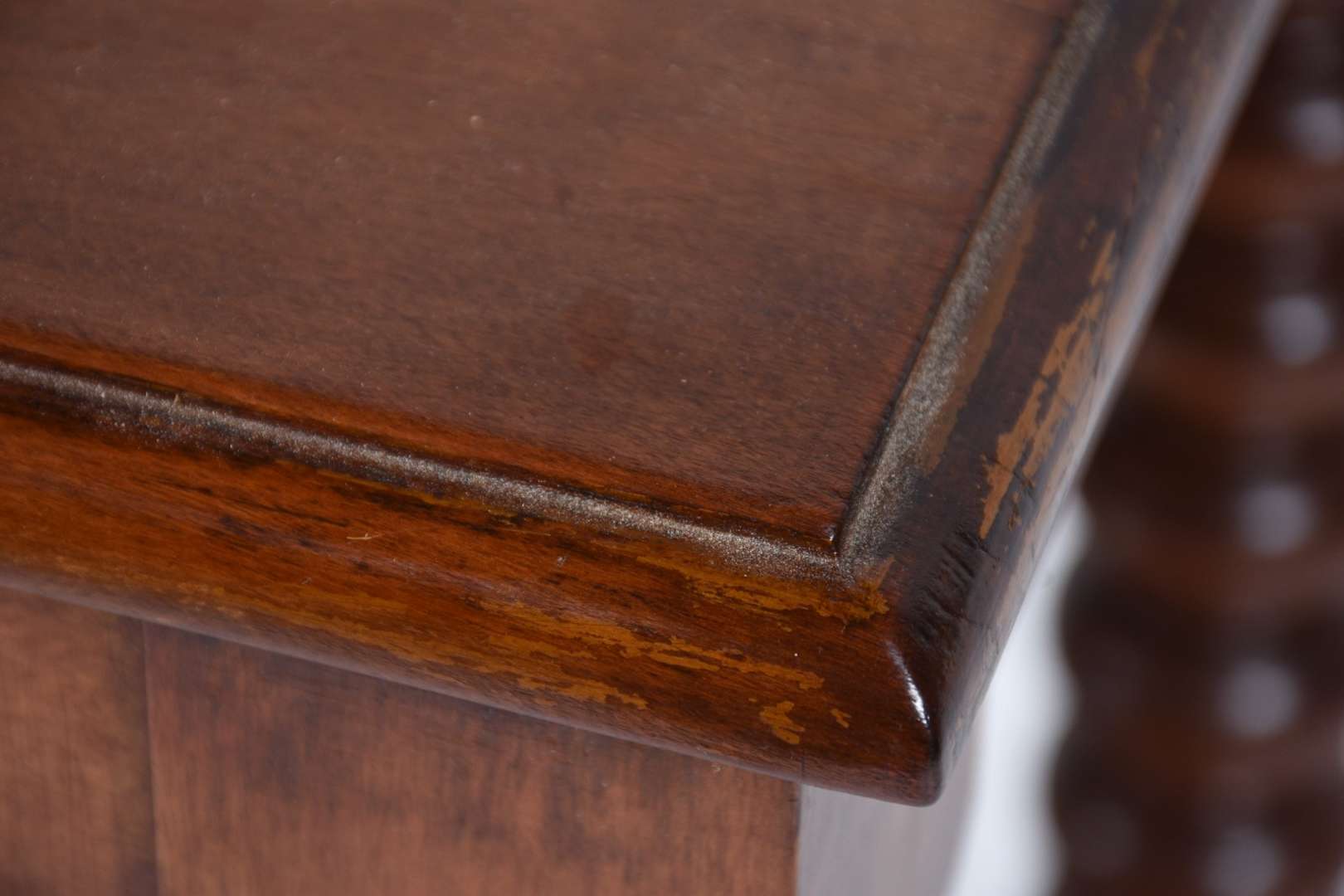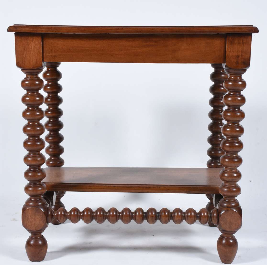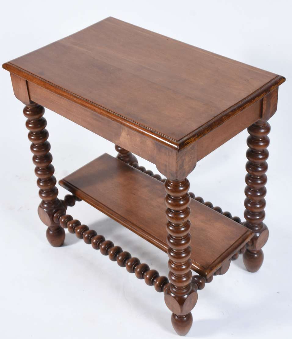 Mesa de madeira nobre feitio oitavado, saia entalhada, pernas torneadas ligadas por traves inferiores. Com desgastes.