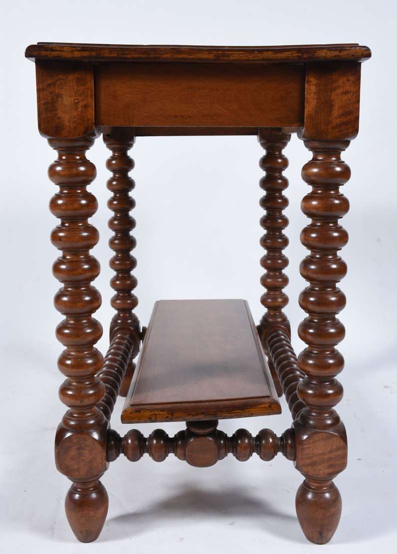 Mesa/aparador de pinho de riga, tampo retangular com saia recortada em gomos, uma gaveta com puxador de metal, duas p...
