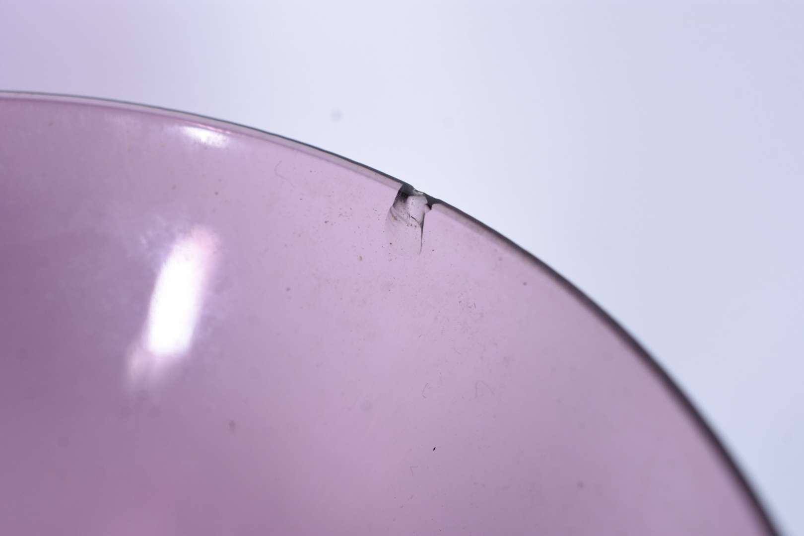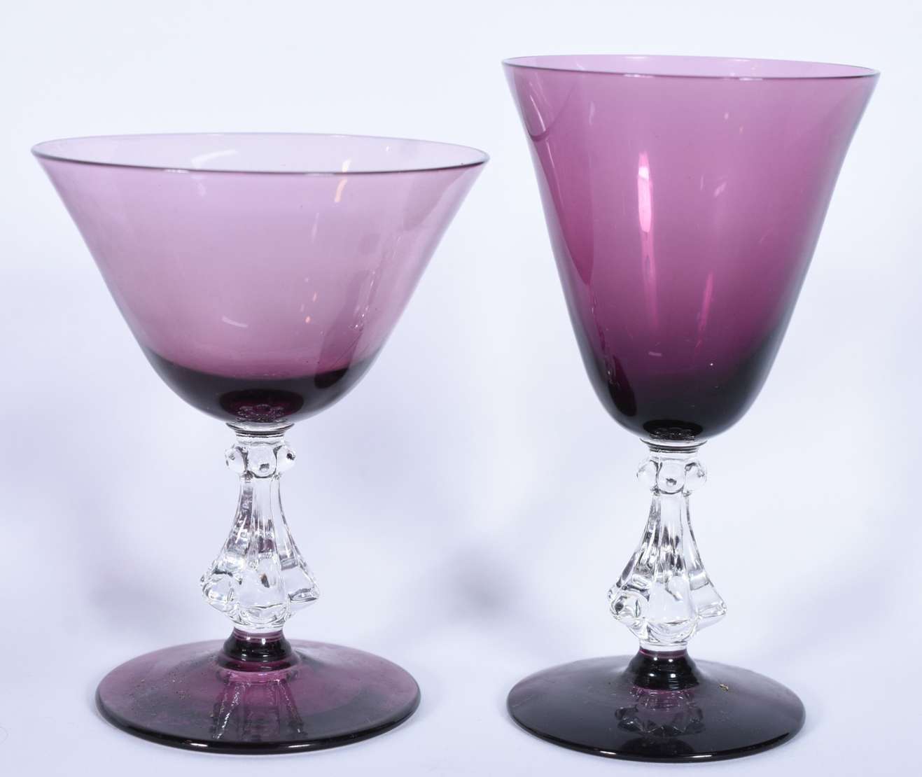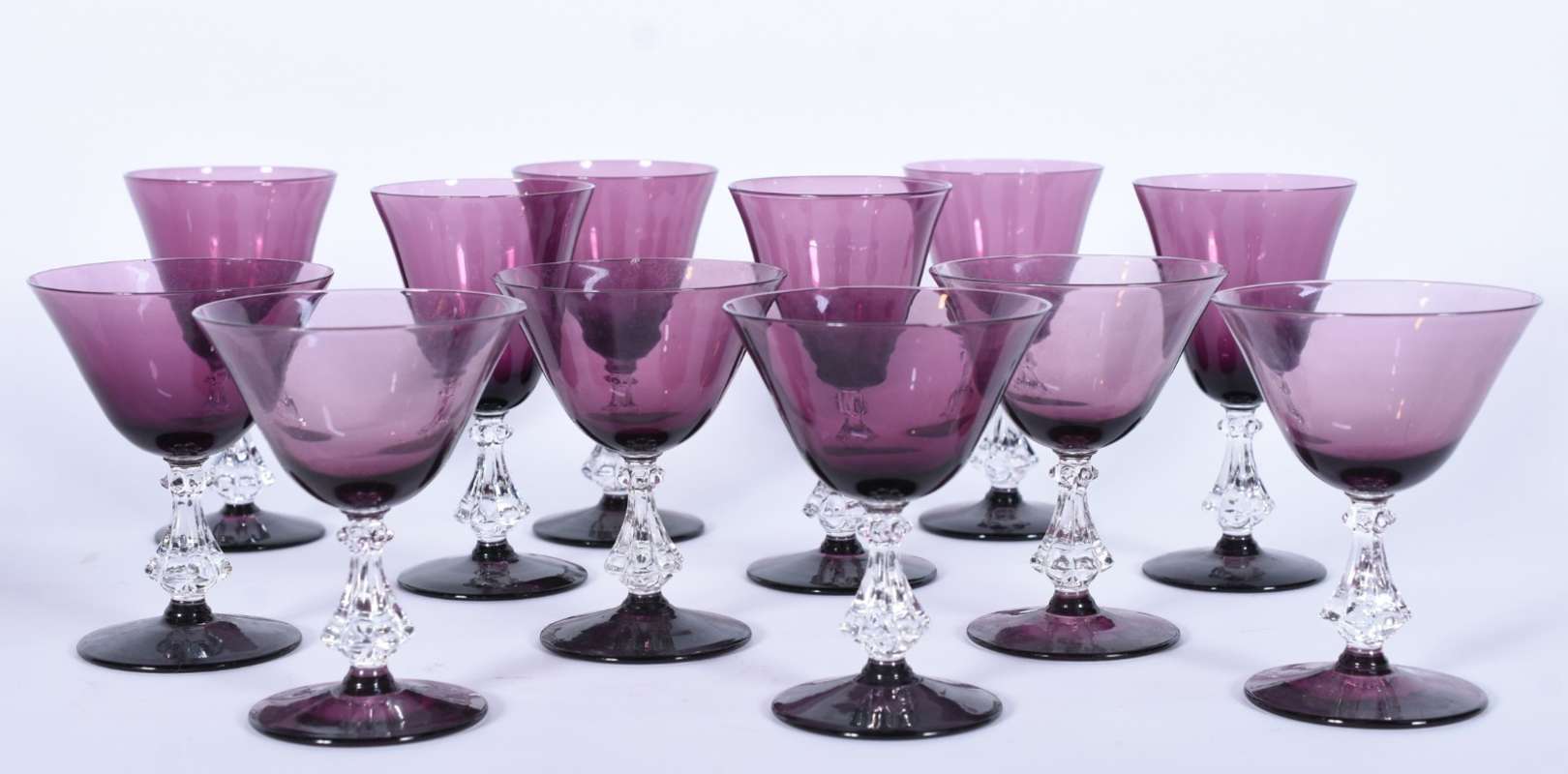 Serviço de taças de vidro na cor uva, composto de: 6 para vinho (1 com bicado) e 6 para champagne (1 com bicado). Total: 12 peças.