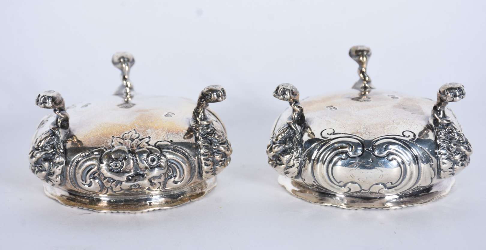 Baixela de chá e café de prata contraste 800 mls., ricamente decorada com figuras de anjos em relevo e guirlandas flo...