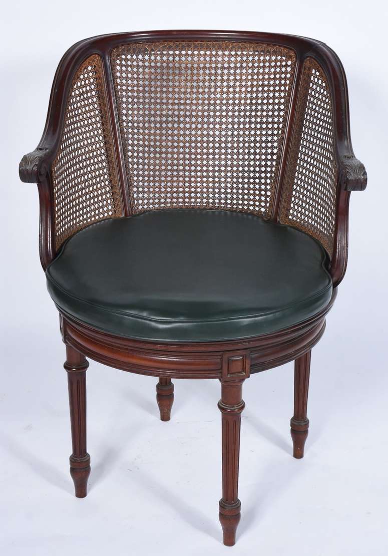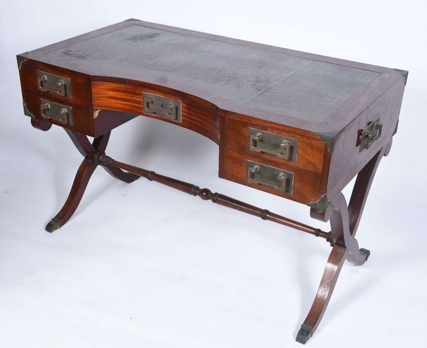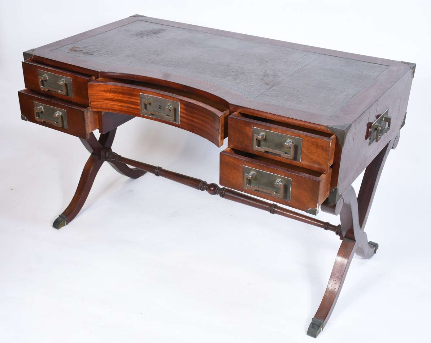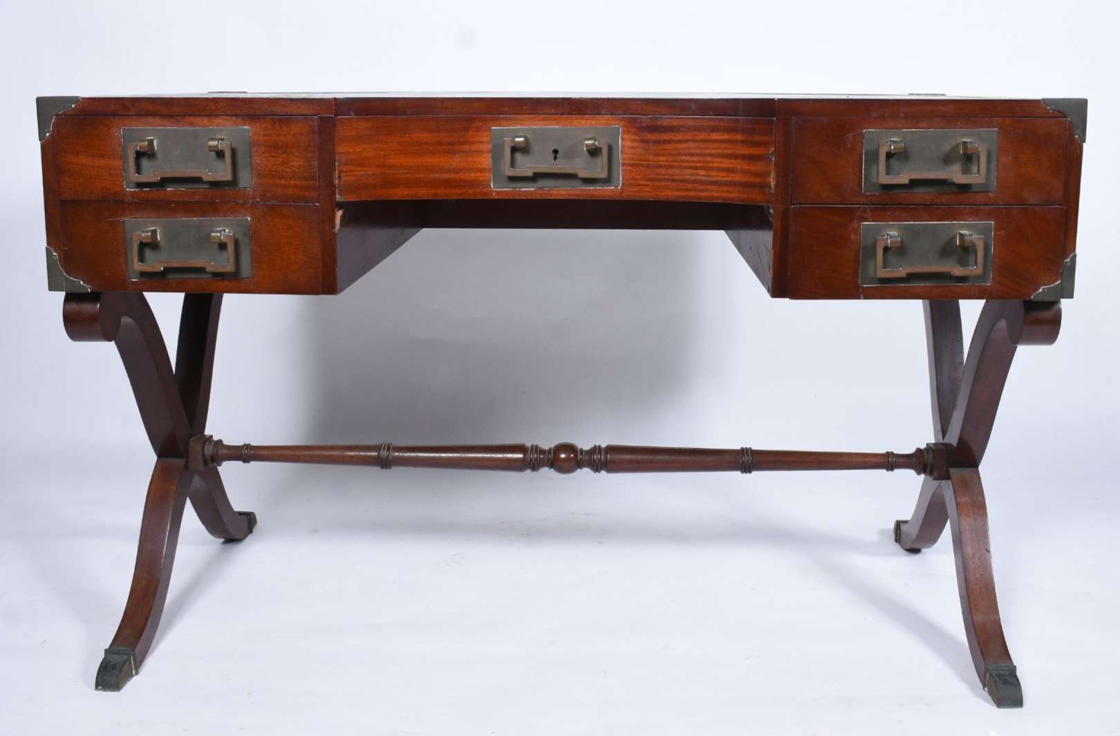 Mesa de escritório de madeira nobre, cinco gavetas com puxadores embutidos estilo "navy", pernas em X ligadas por trave central, ponteiras de metal. Tampo com forração desgastada. Acompanha cadeira de madeira, assento e encosto arredondado forrado com palhinha, almofada solta, pernas cilíndricas torneadas.