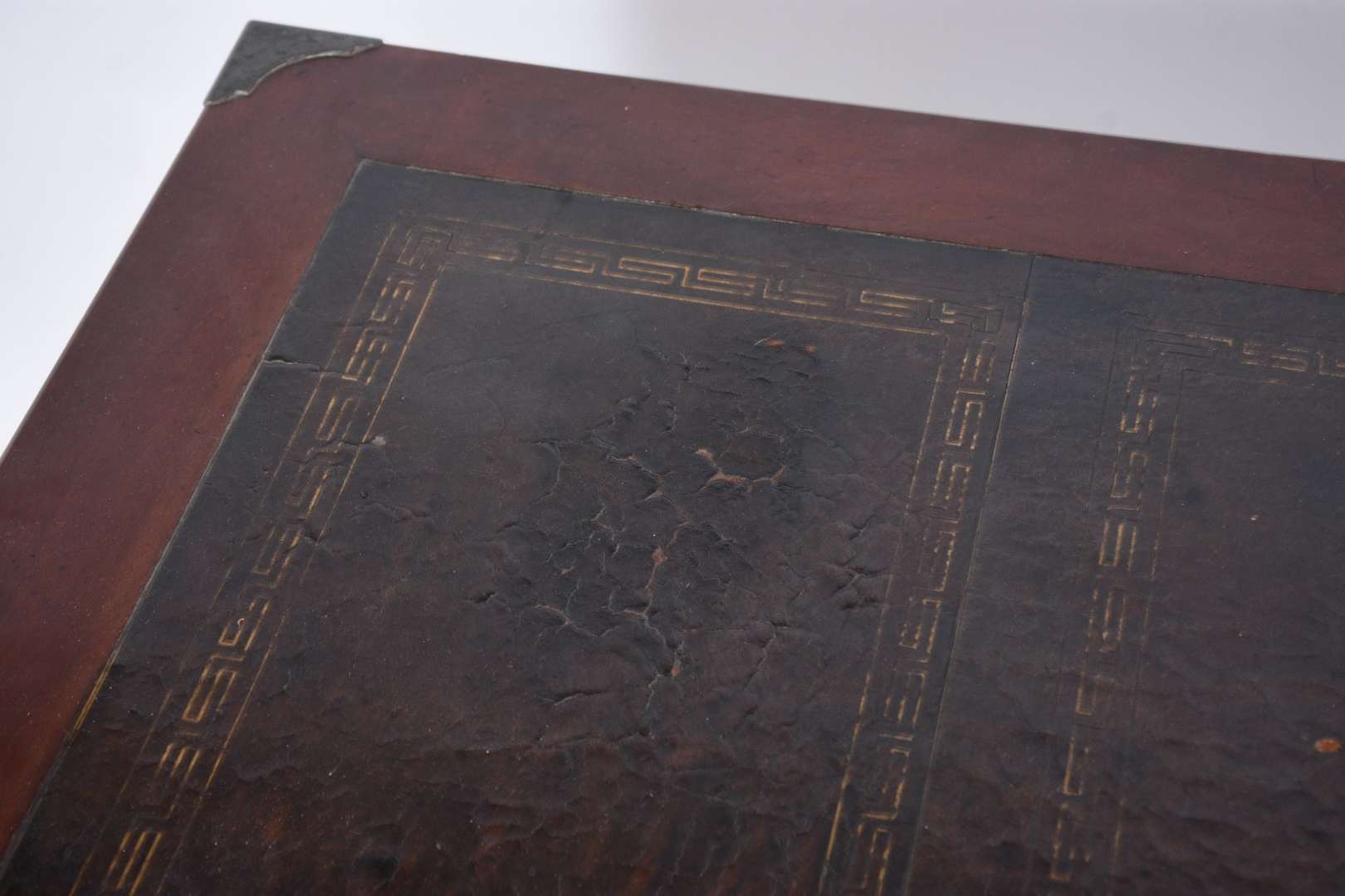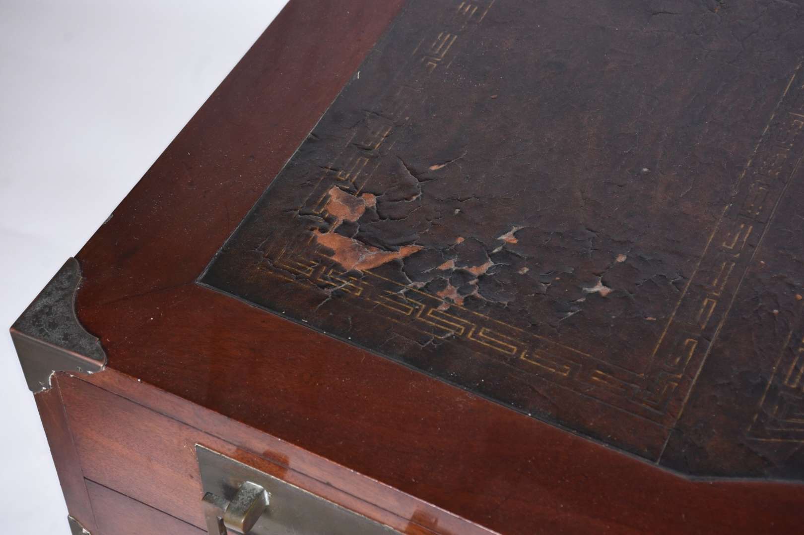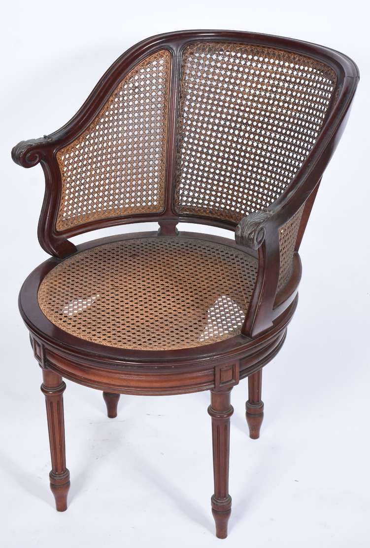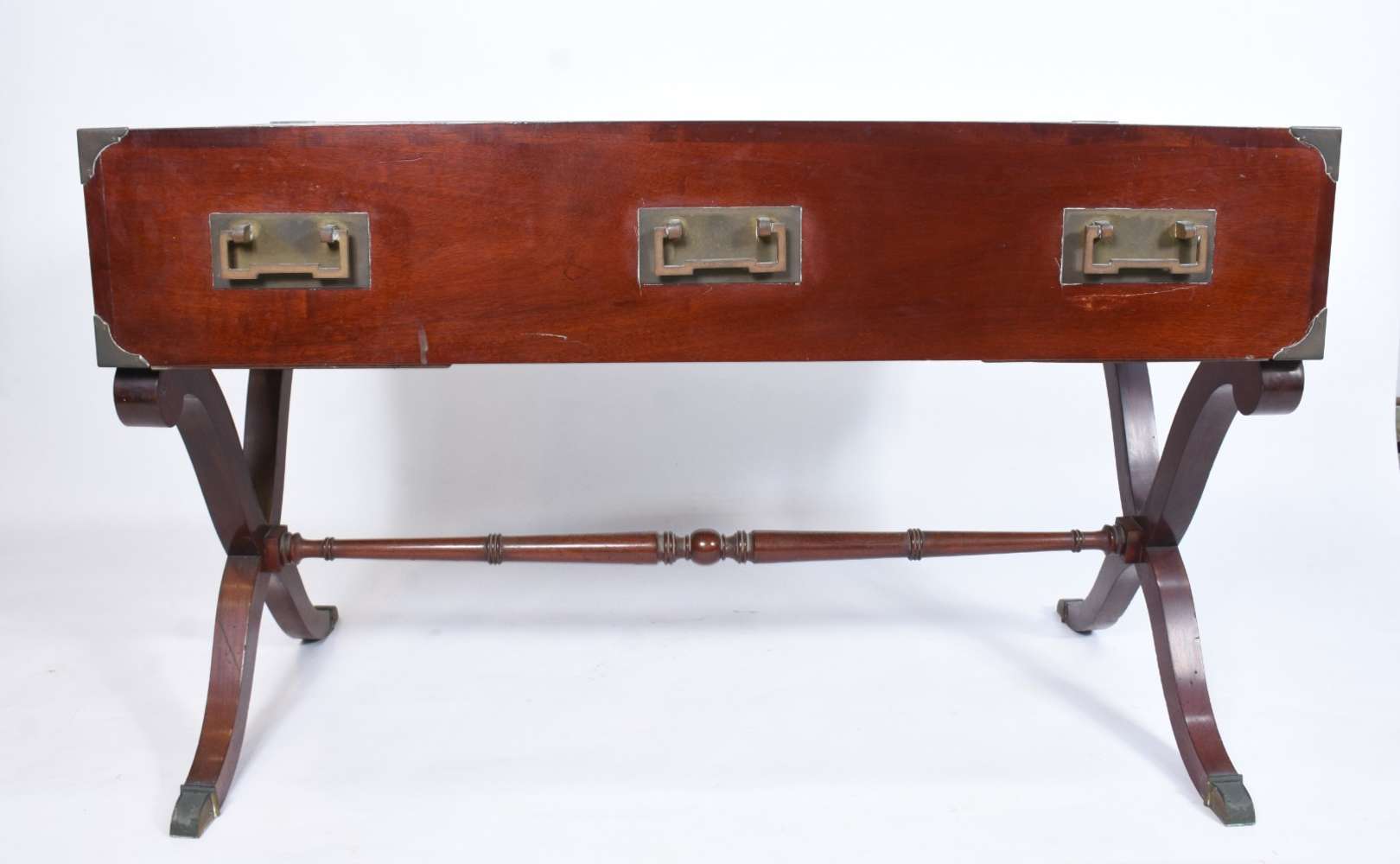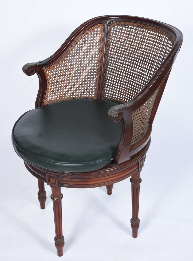 Mesa de escritório de madeira nobre, cinco gavetas com puxadores embutidos estilo "navy", pernas em X ligadas por trave central, ponteiras de metal. Tampo com forração desgastada. Acompanha cadeira de madeira, assento e encosto arredondado forrado com palhinha, almofada solta, pernas cilíndricas torneadas.