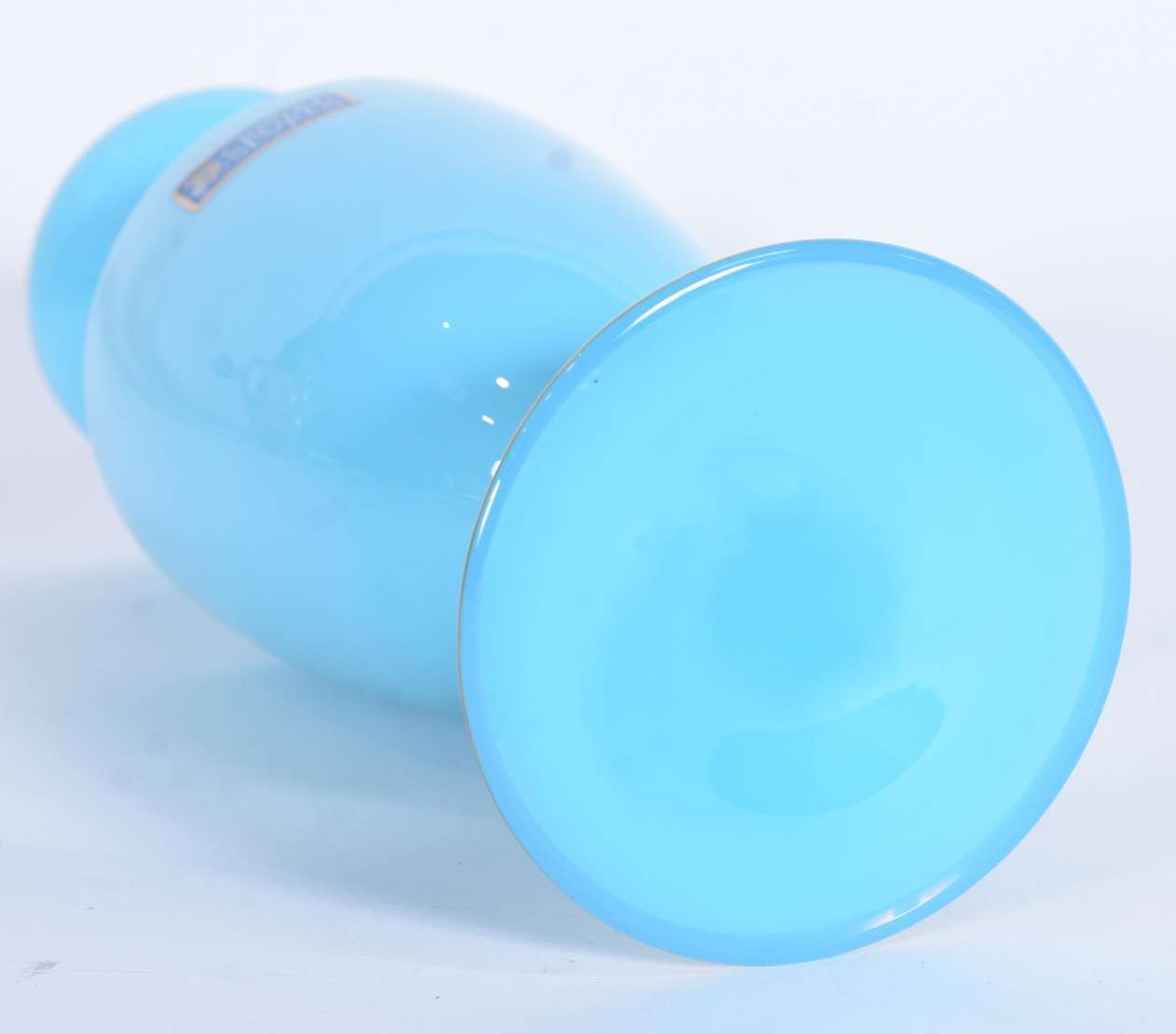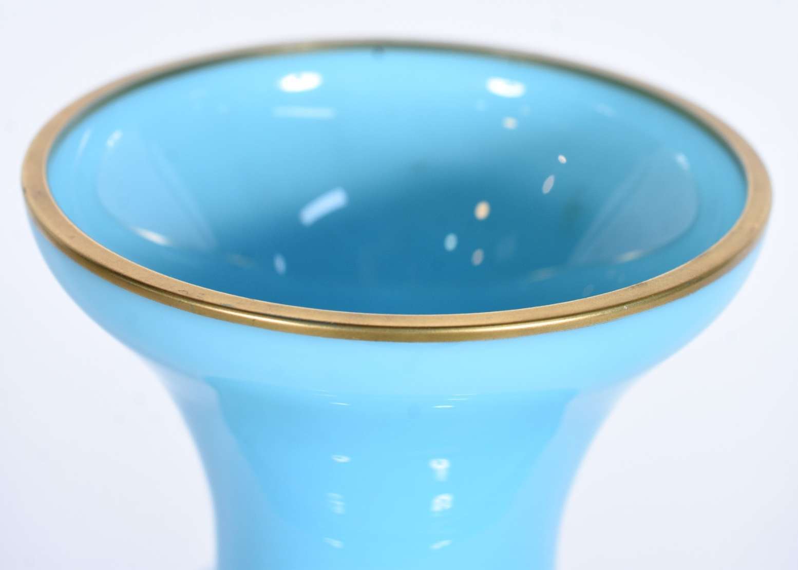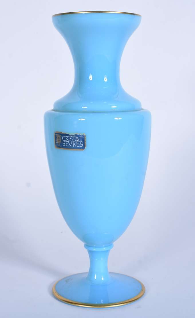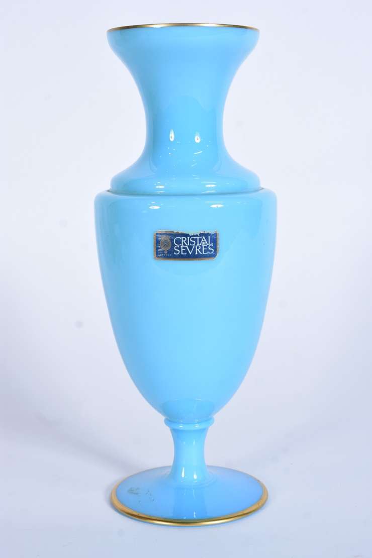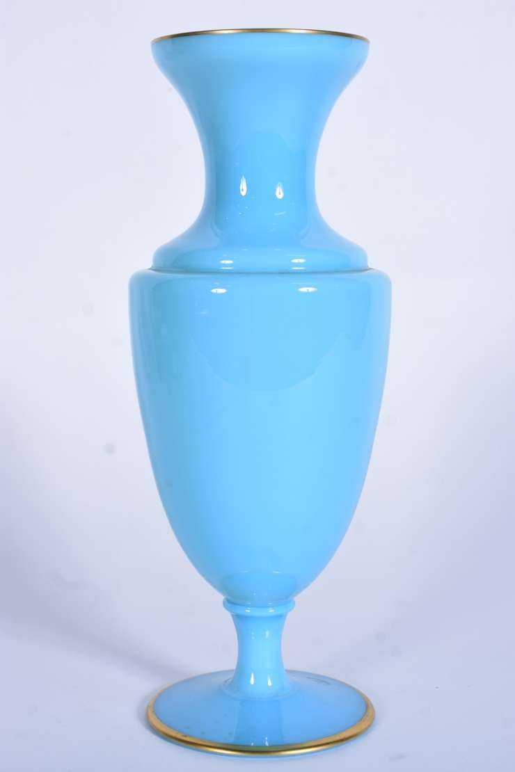 Par de antigos vasos de opalina francesa na cor azul celeste com flores em relevo e resquícios de frisos dourados na ...