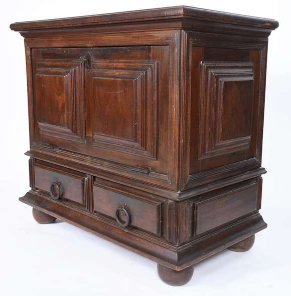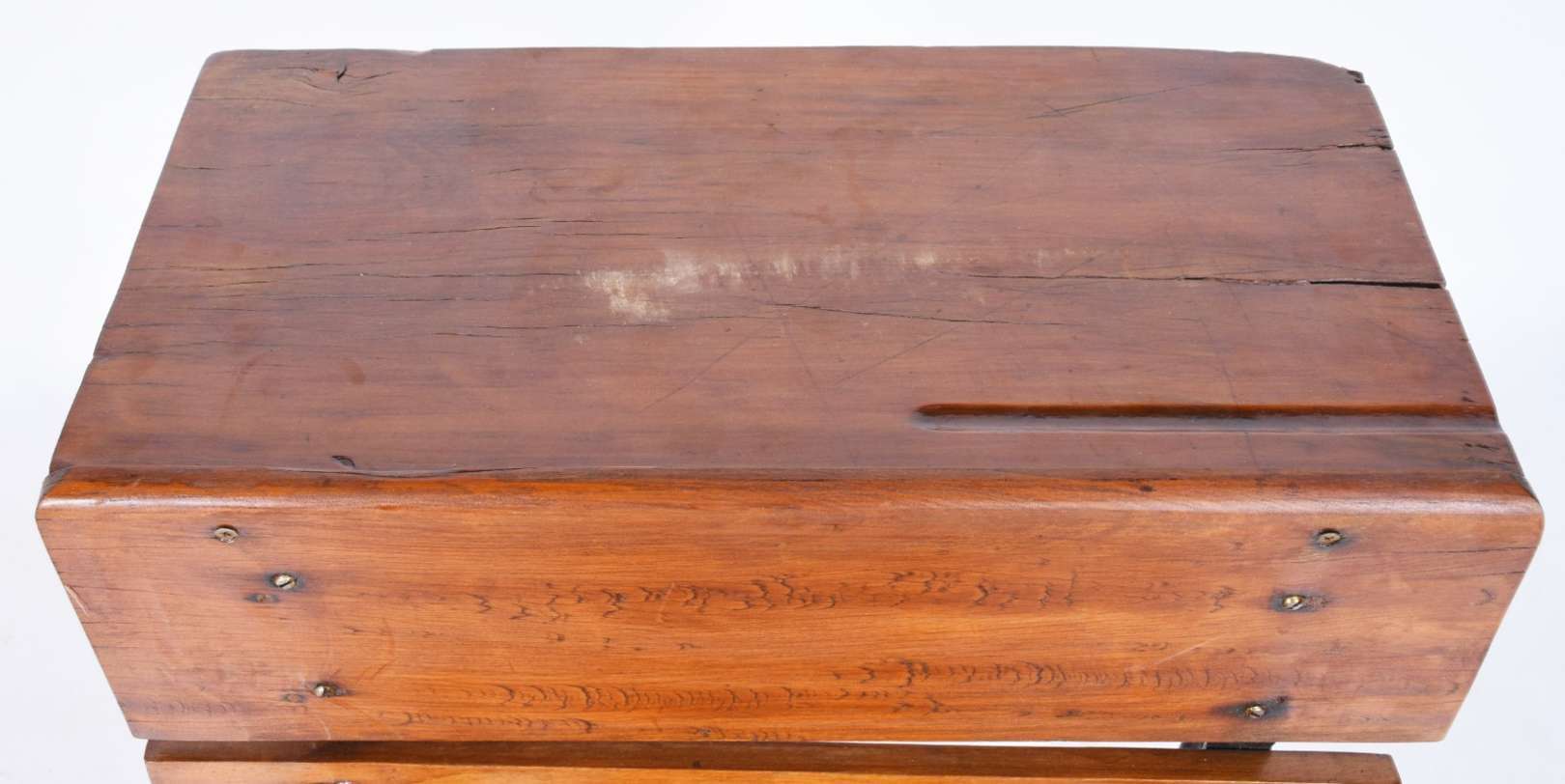 Arca de madeira nobre estilo colonial brasileiro, platô articulado e duas gavetas na parte inferior.