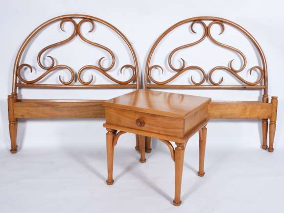 Par de camas de solteiro e mesinha de cabeceira com uma gaveta de madeira nobre, estilo austríaco. Fabricação GERDAU.