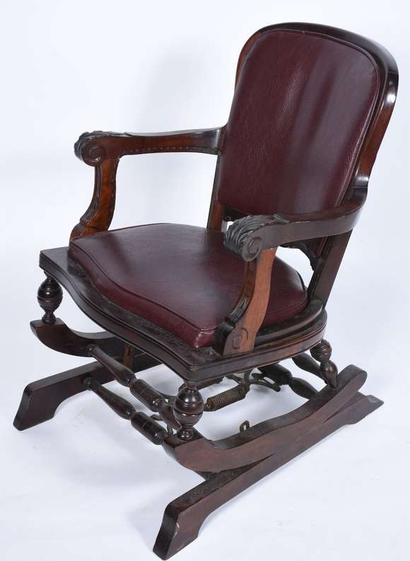 Cadeira de balanço de madeira nobre, assento e encosto estofado e forrado com curvim na cor vinho Partes coladas e pr...