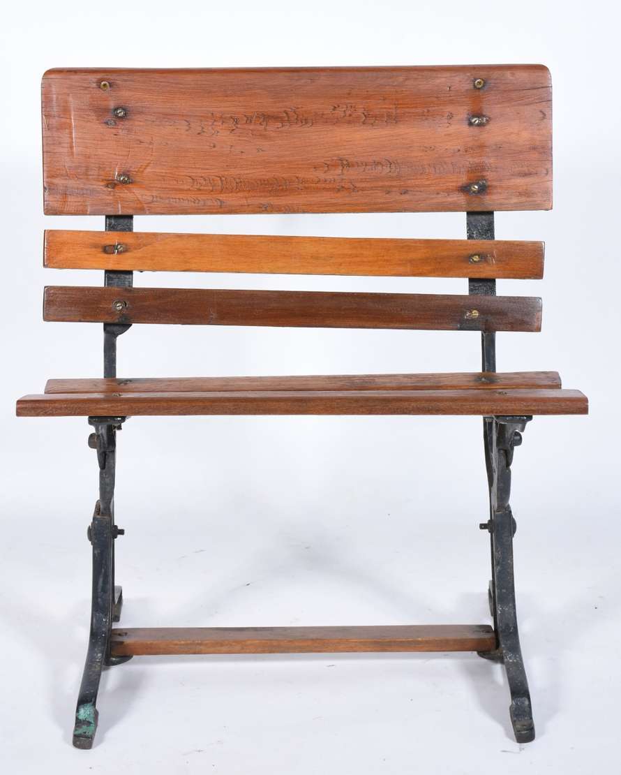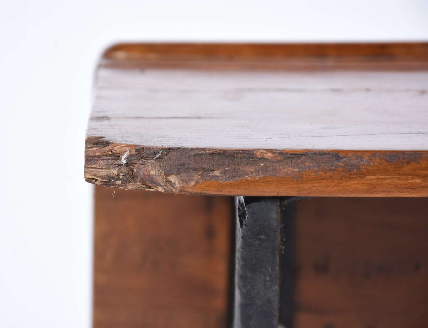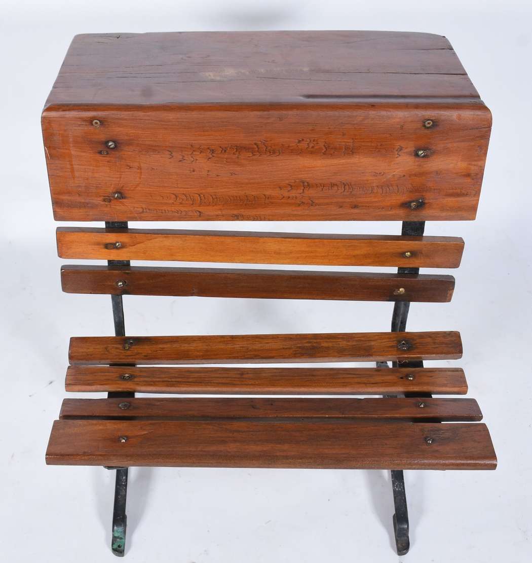 Banco/baú de madeira patinada, encosto com trave recortada em gomos.