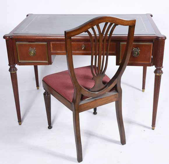 Mesa de escritório de madeira nobre, 3 gavetas. Tampo na cor verde (desgastes). Estilo inglês. Acompanha cadeira esti...