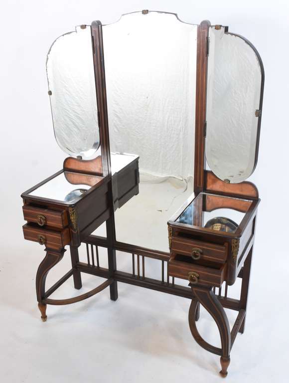Penteadeira art deco de madeira nobre, espelhos laterais articulados, duas gavetinhas de cada lado unidas por traves ...