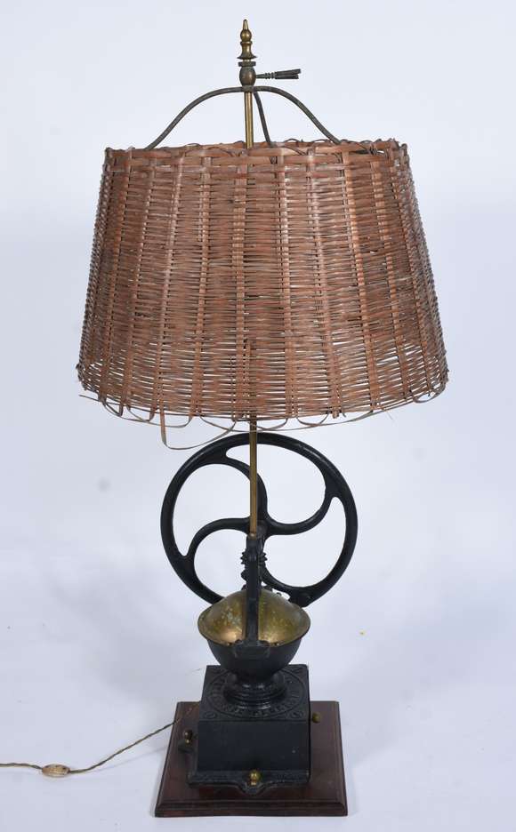 Abatjour com base feita por antiga máquina de moer café, cúpula em vime (cúpula no estado).