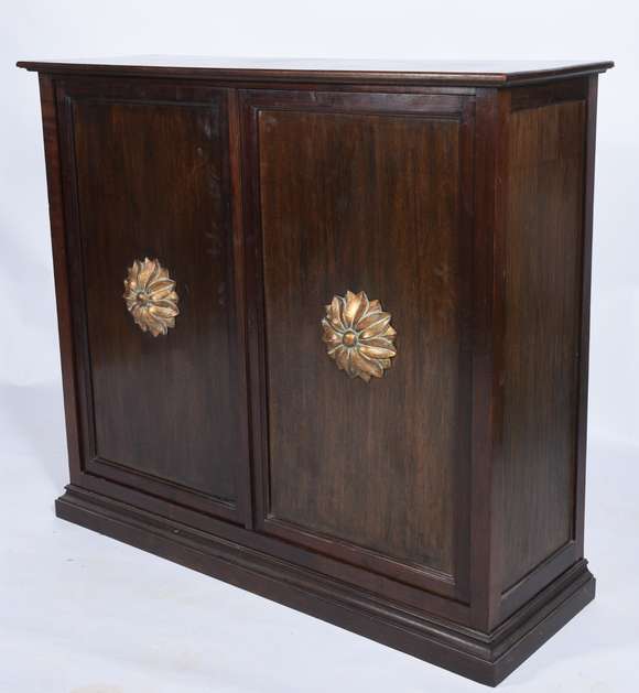 Cristaleira de madeira nobre, duas portas de madeira, fundo espelhado.